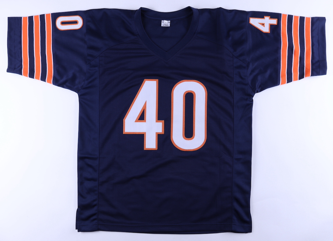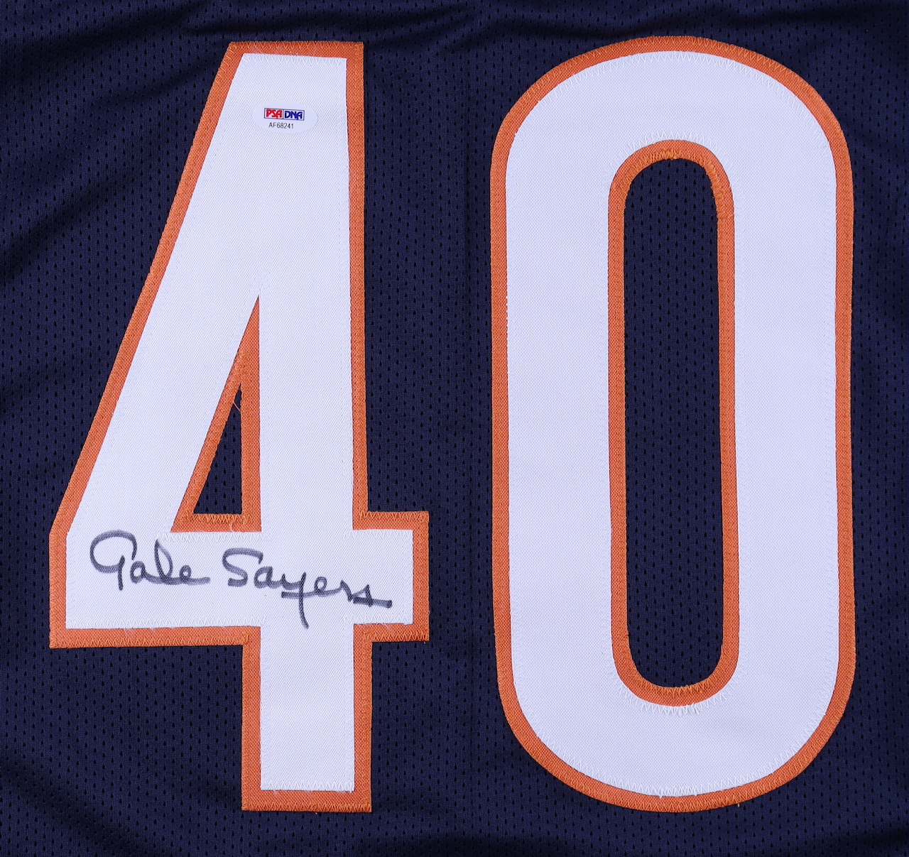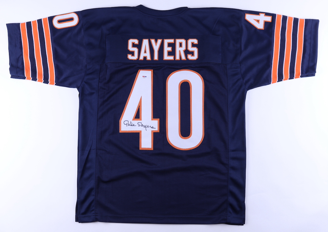 Custom on-field style jersey. Everything is sewn on, size XL. Hand-signed by Gale Sayers (D. 2020, HOF).