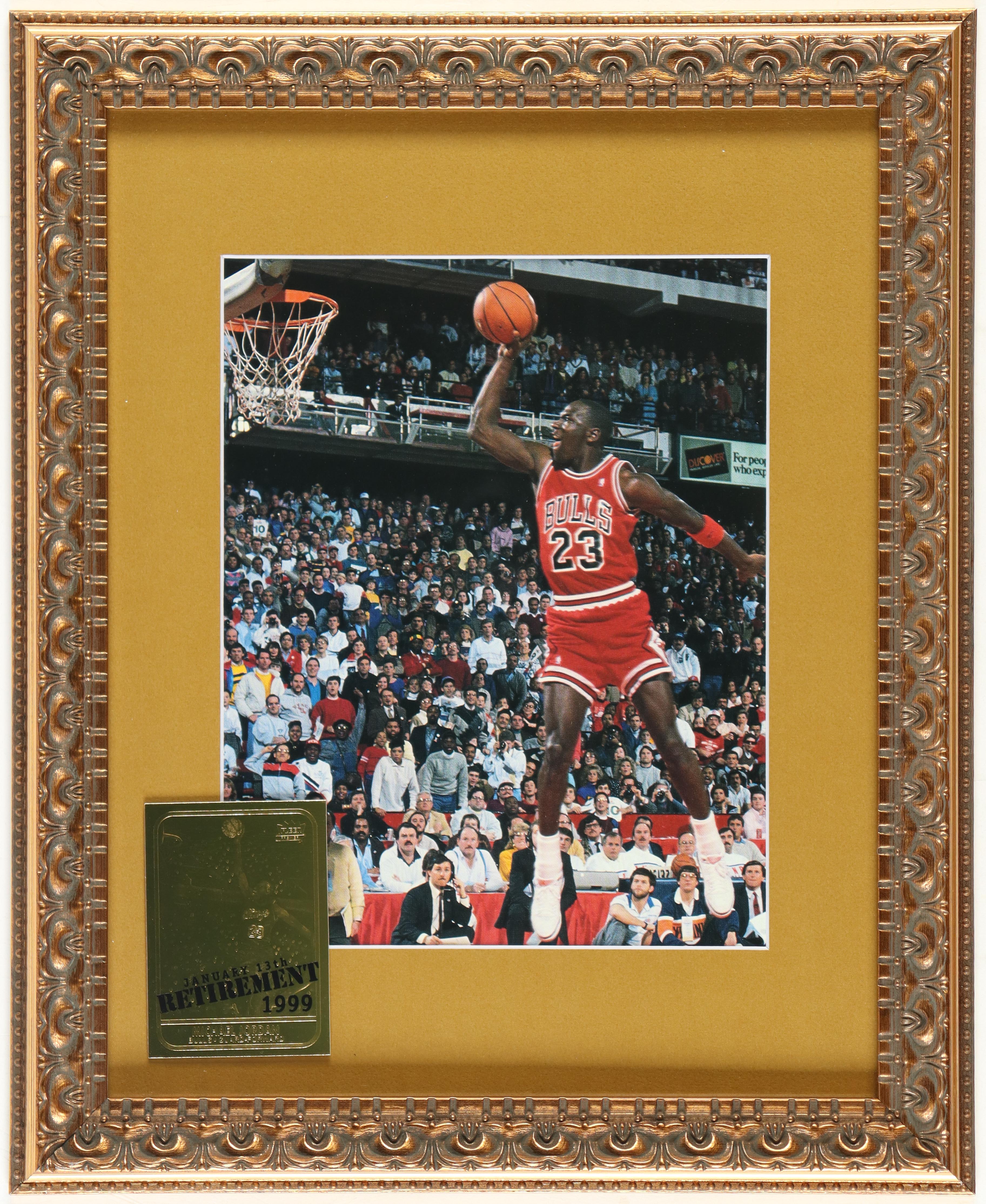 Custom frame measures 13.5" x 16.5" in size and features an unsigned photo of Michael Jordan (Chicago Bulls) as well as a 23KT gold Fleer trading card. Please note, the display is unsigned.