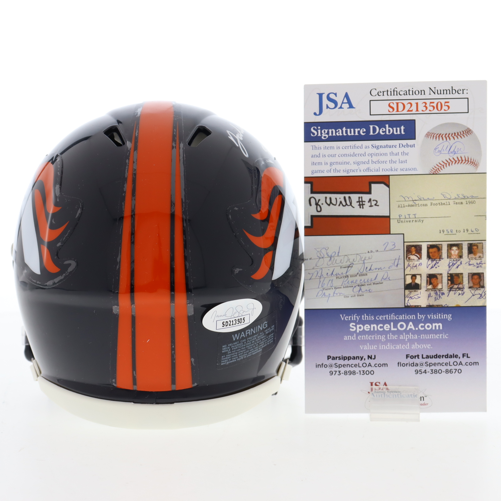 The autograph(s) includes an official James Spence Authentication (JSA) "Signature Debut" hologram and COA. "Signature Debut" is the autographed memorabilia equivalent to a rookie card. The JSA definition of a "Signature Debut" is as follows: "Any item that is autographed and received by JSA prior to the last game of the signer's official rookie season.