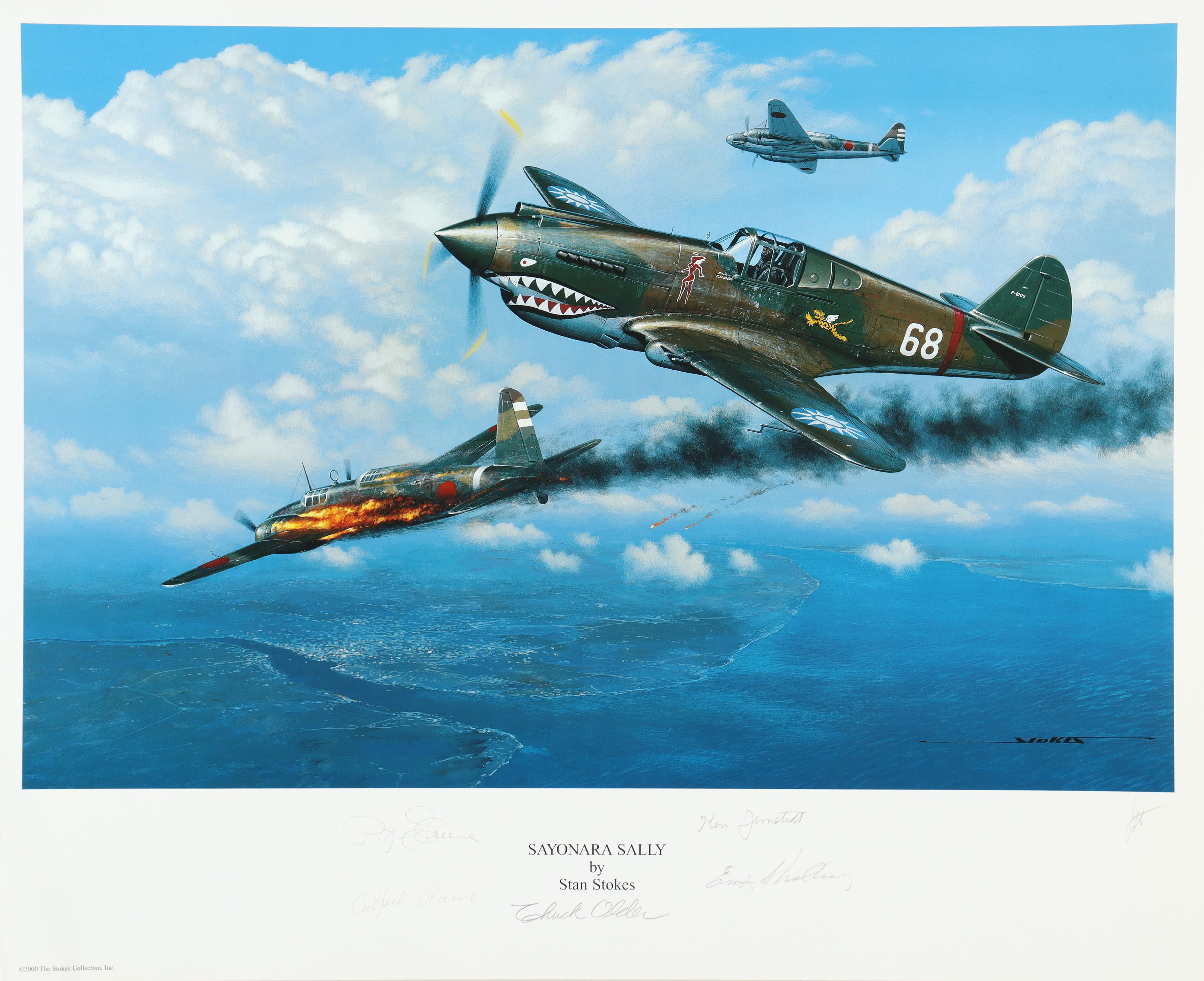 'Sayonara Sally' Lithograph measures approximately 18" x 22" in size. Hand-signed by Charles Older (D. 2006, WWII Pilot), Ken Jernstedt (D. 2013, WWII Pilot), Paul Greene, Robert Raine & Erik Shilling. Lithograph is also signed by its artist Stan Stokes. Please note, lithograph has natural toning on the edges.