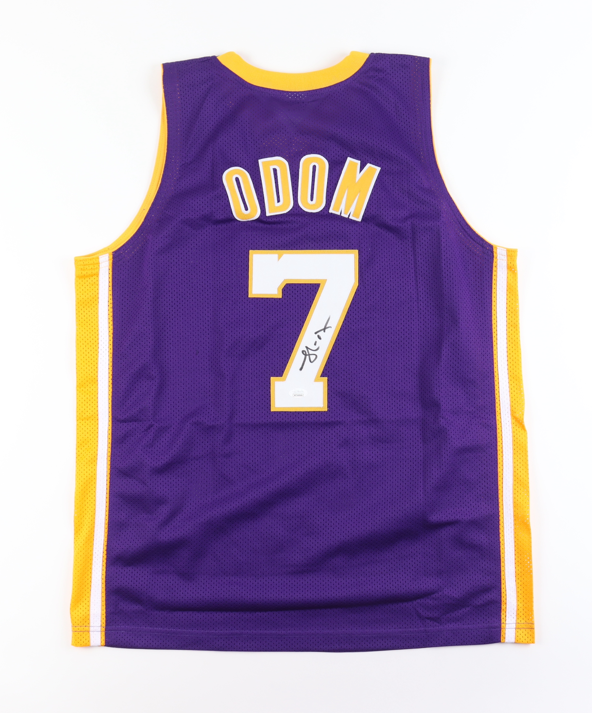 Custom jersey with everything sewn on, size L. Hand-signed by Lamar Odom.