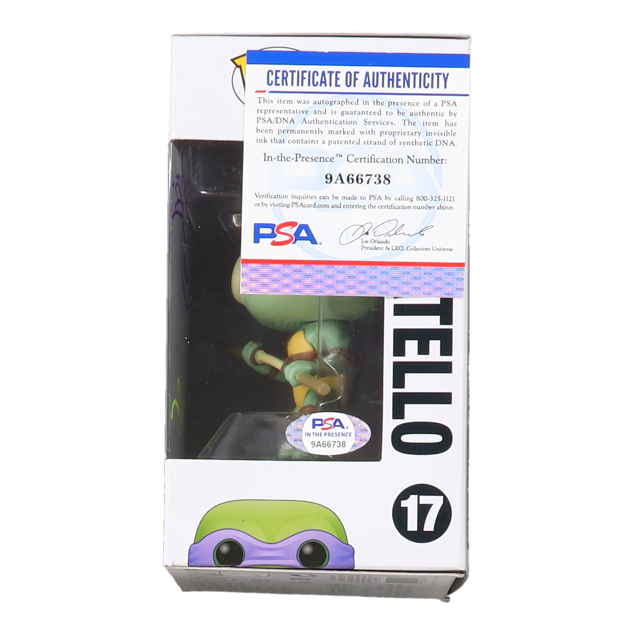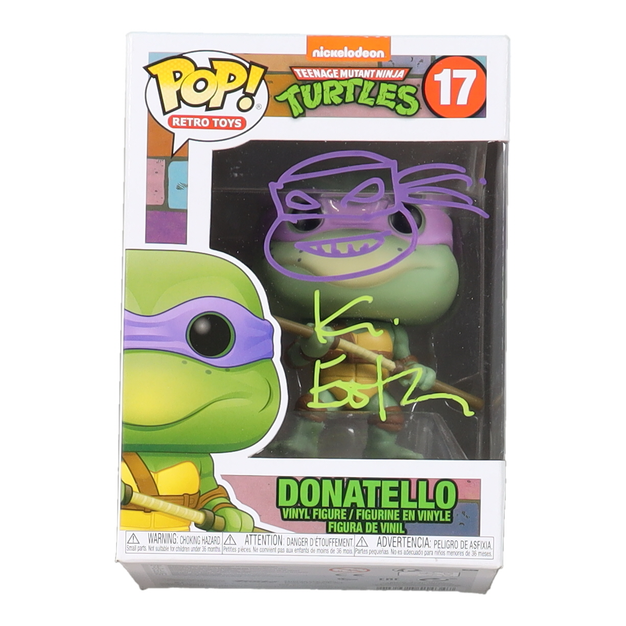 Funko Pop! figure measures approximately 4" tall and has been hand-signed on the packaging by Kevin Eastman (Co-Creator of "Teenage Mutant Ninja Turtles").