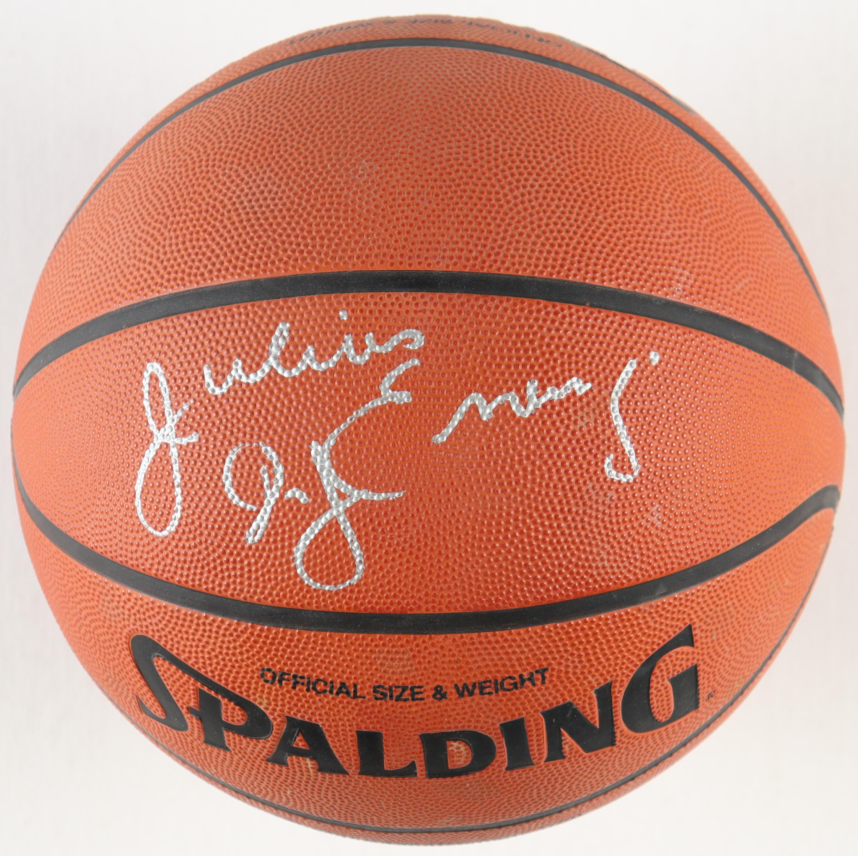 Spalding NBA outdoor basketball has been hand-signed by Julius Erving (Philadelphia 76ers, HOF). Please note, baketball is stained.