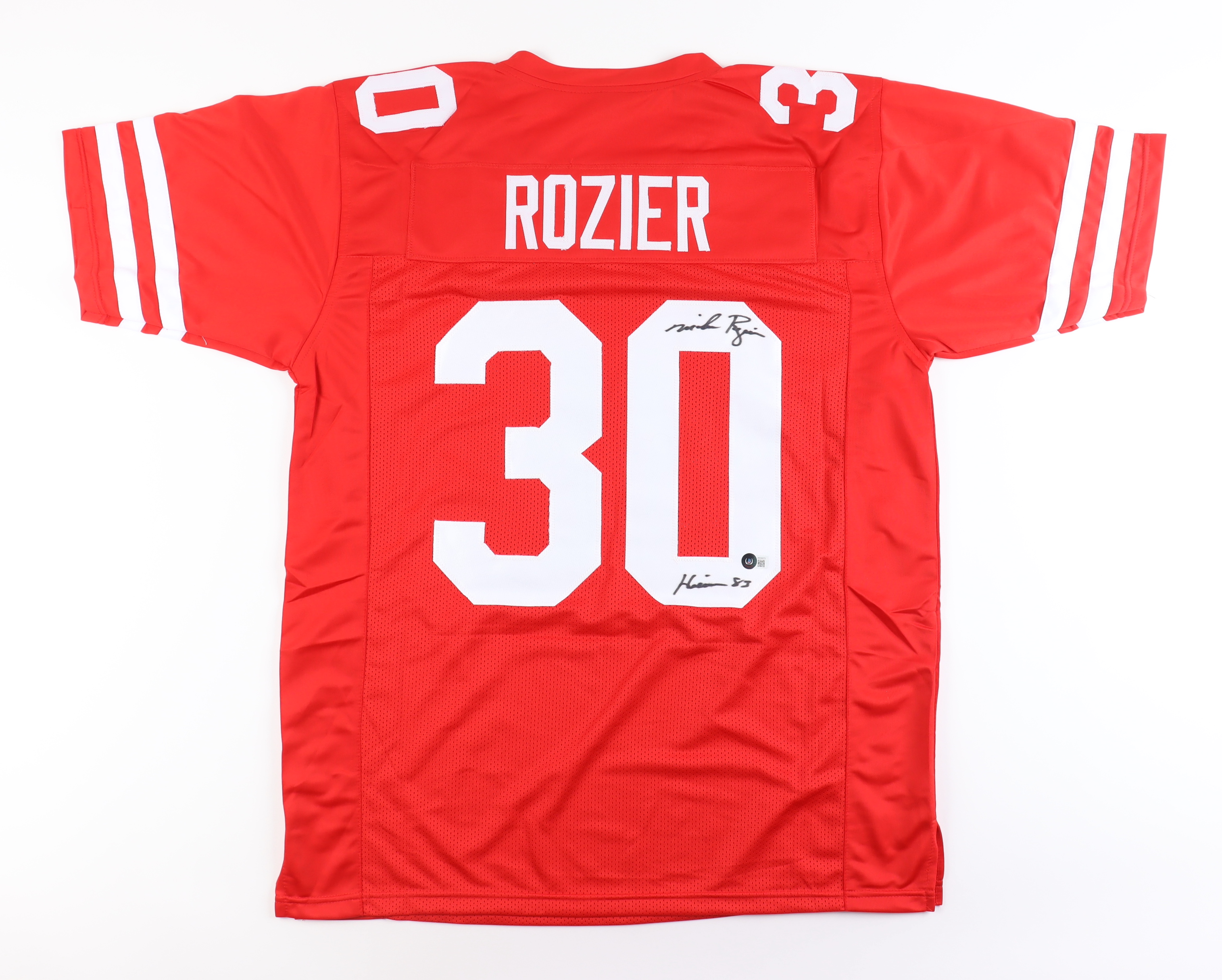 Custom jersey with everything sewn on, size XL. Hand-signed by Mike Rozier.