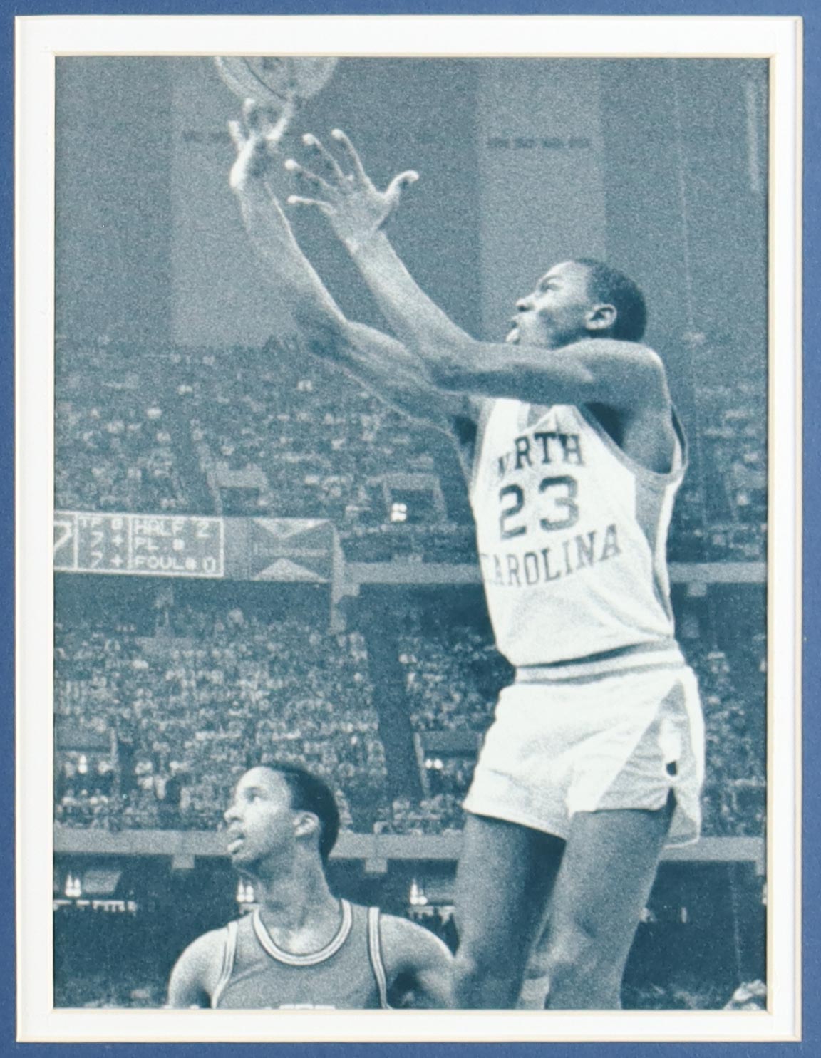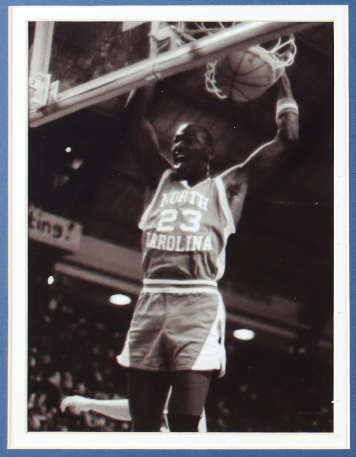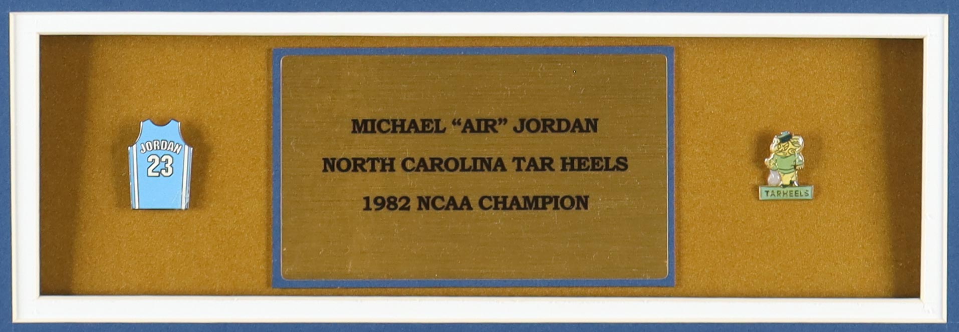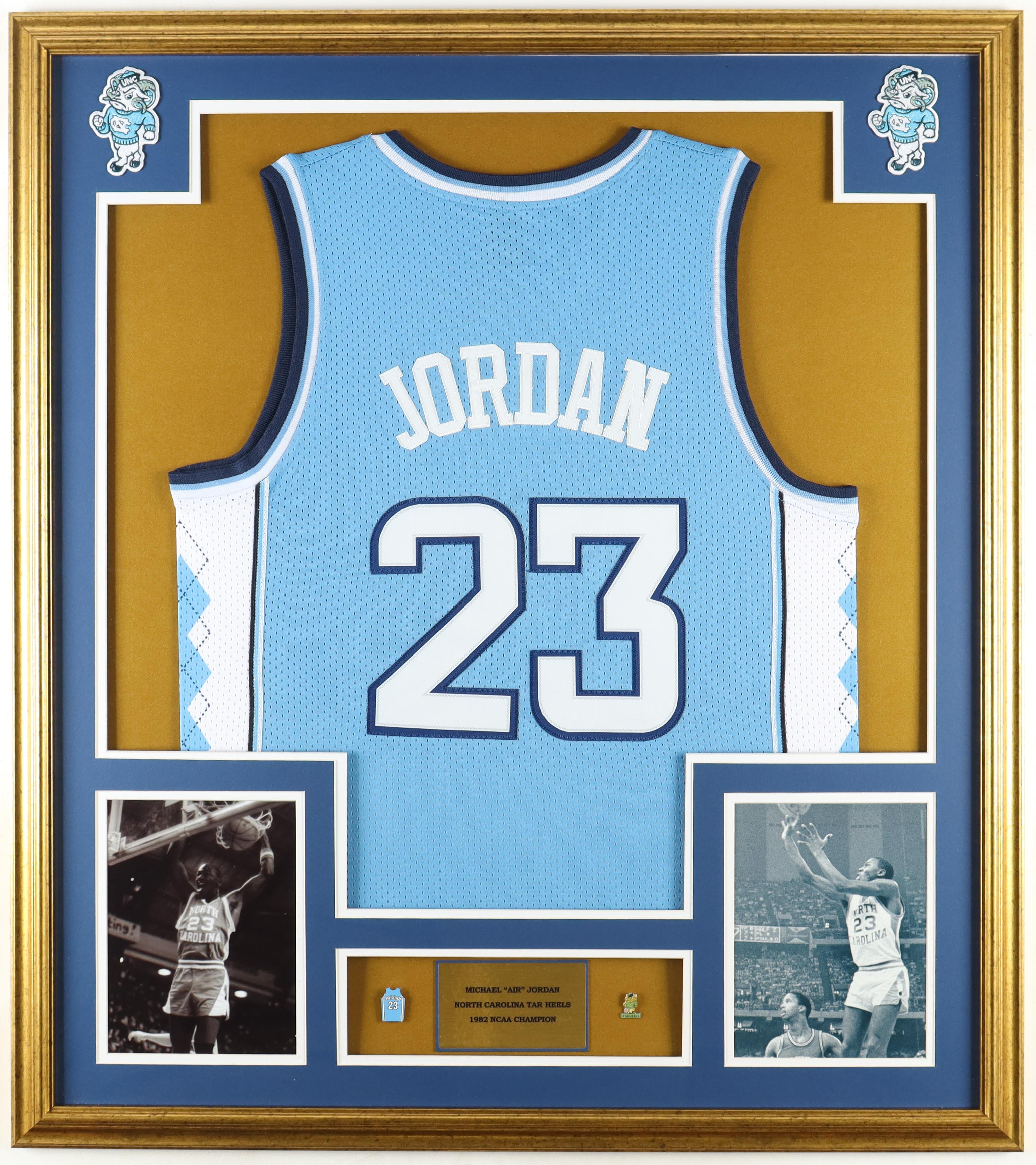 Custom framed display measures 33" x 37" in size and includes an unsigned Michael Jordan (HOF) jersey and also includes a Jordan jersey pin and vintage Tarheels pin.
