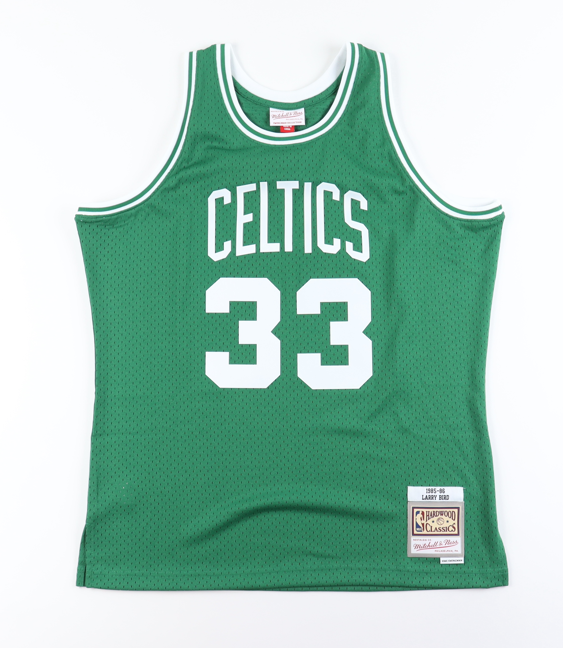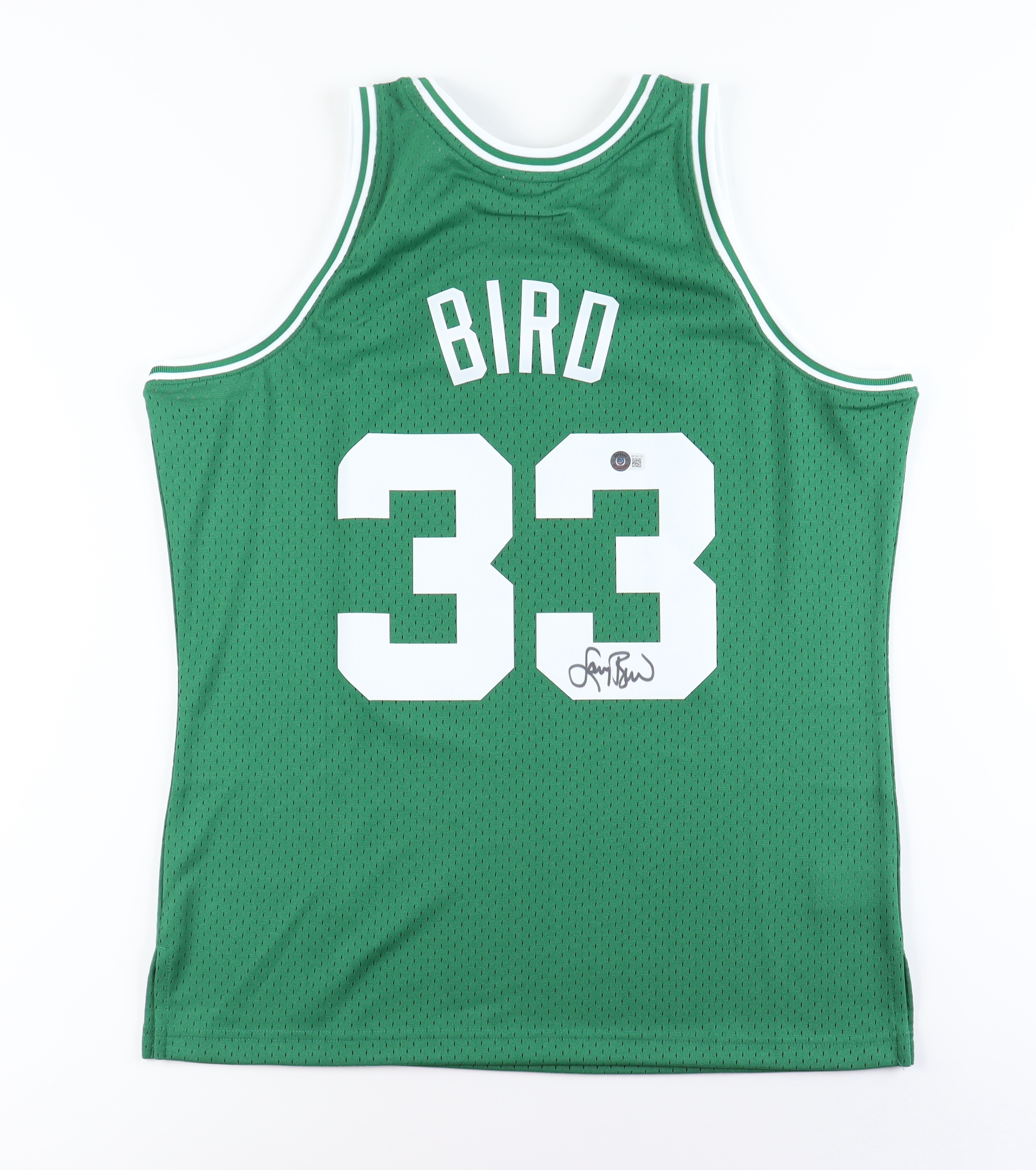 Mitchell & Ness jersey. Everything is pressed on, size L. Hand-signed by Larry Bird (Boston Celtics, HOF).
