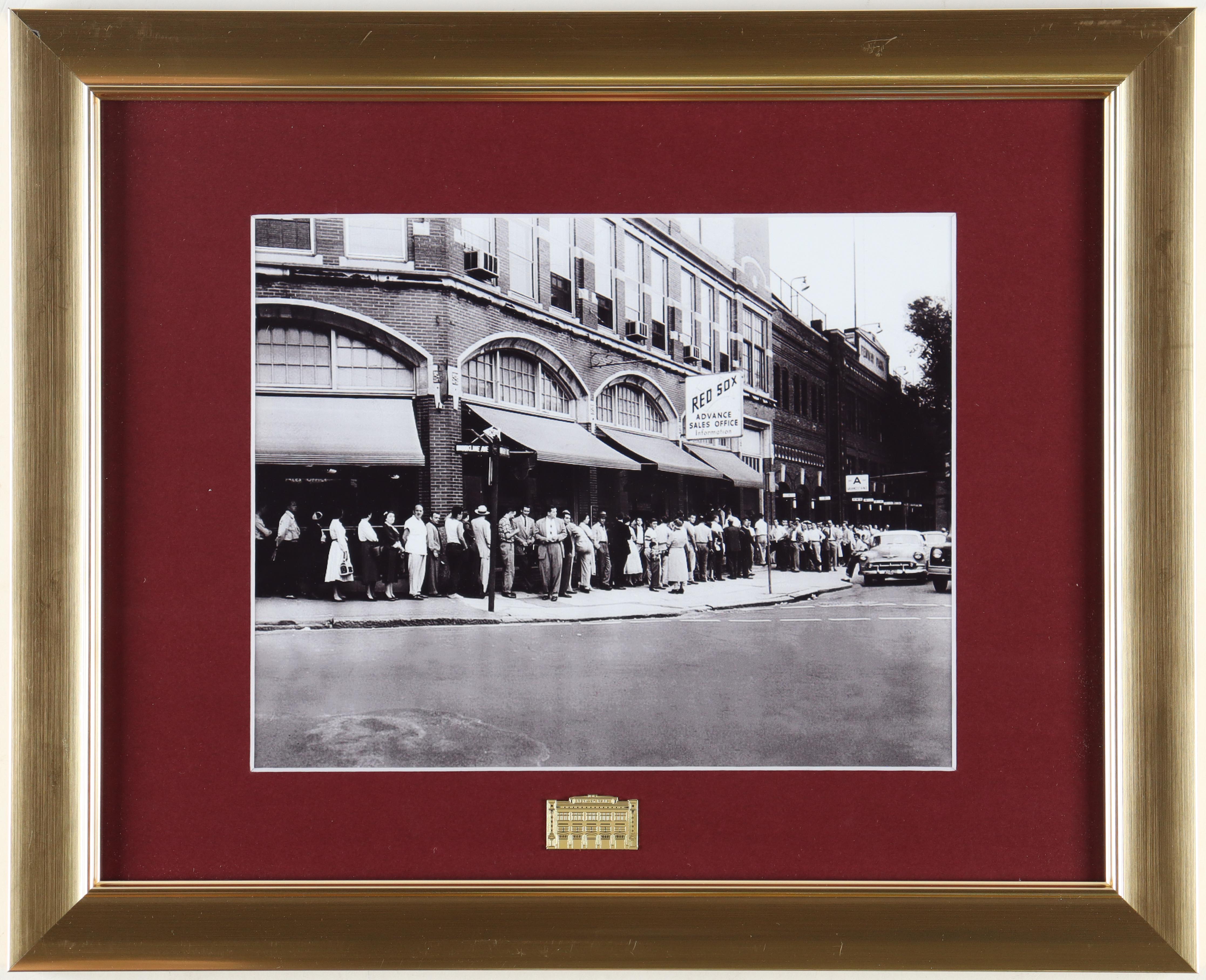Custom display measures 13" x 16" in size, features an unsigned black and white photo of Fenway Park. Includes an official Gold Fenway Park pin.