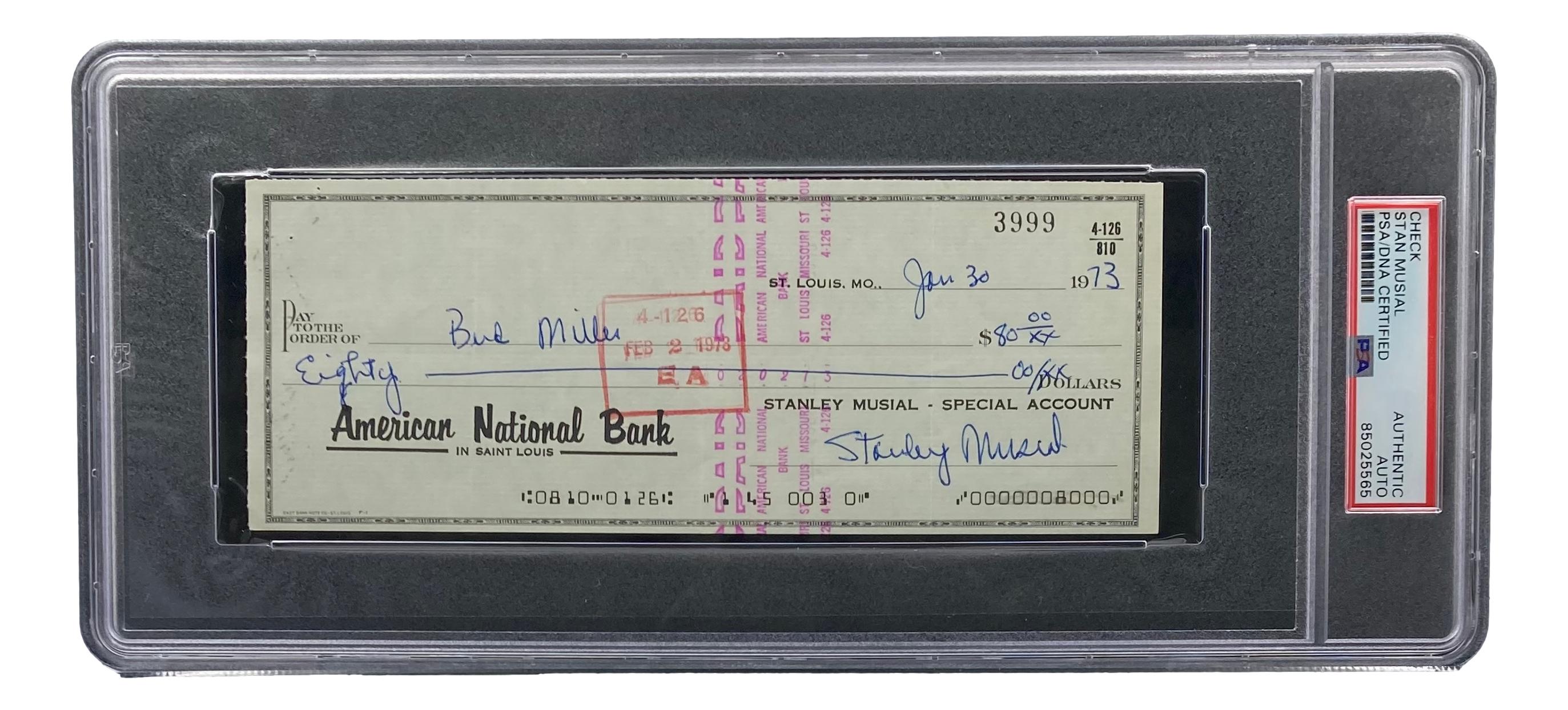Personal bank check has been dated January 30th, 1973. Hand-signed by Stan Musial (D.2013, St. Louis Cardinals, HOF).