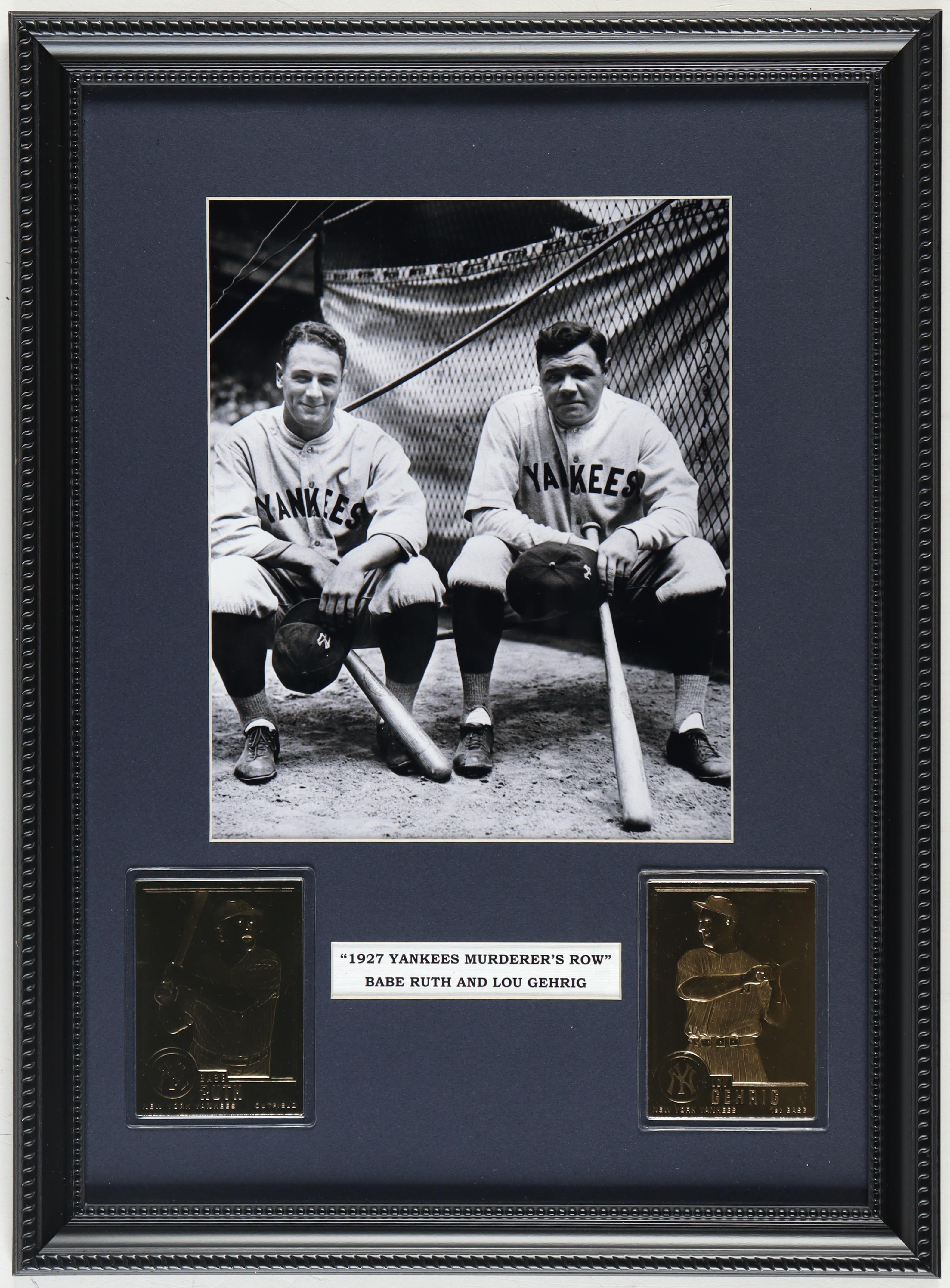 Babe Ruth & Lou Gehrig Custom Framed Black & White Photo Display with 23 Karat Gold Factory Encased Cards