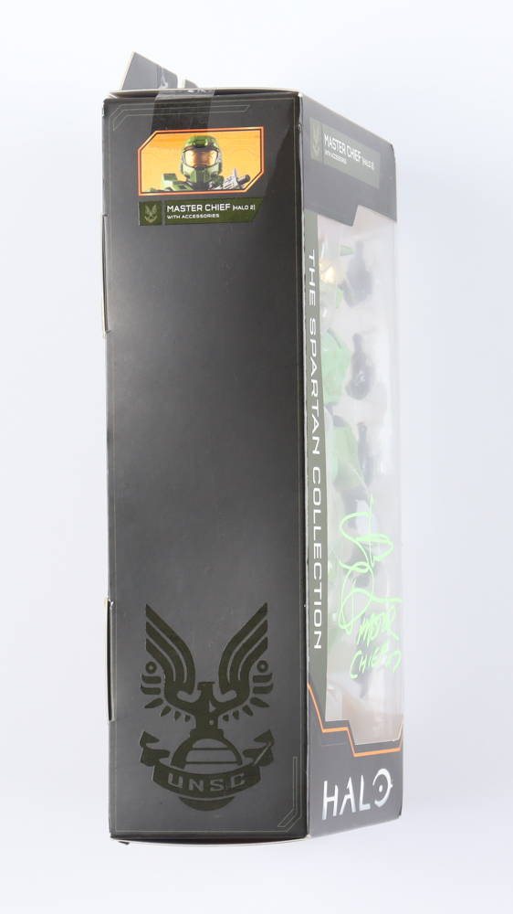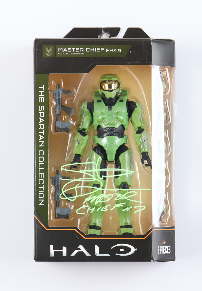 Figure measures approximately 8" tall and comes in the original box. Hand-signed and inscribed by Steve Downes (Master Chief).