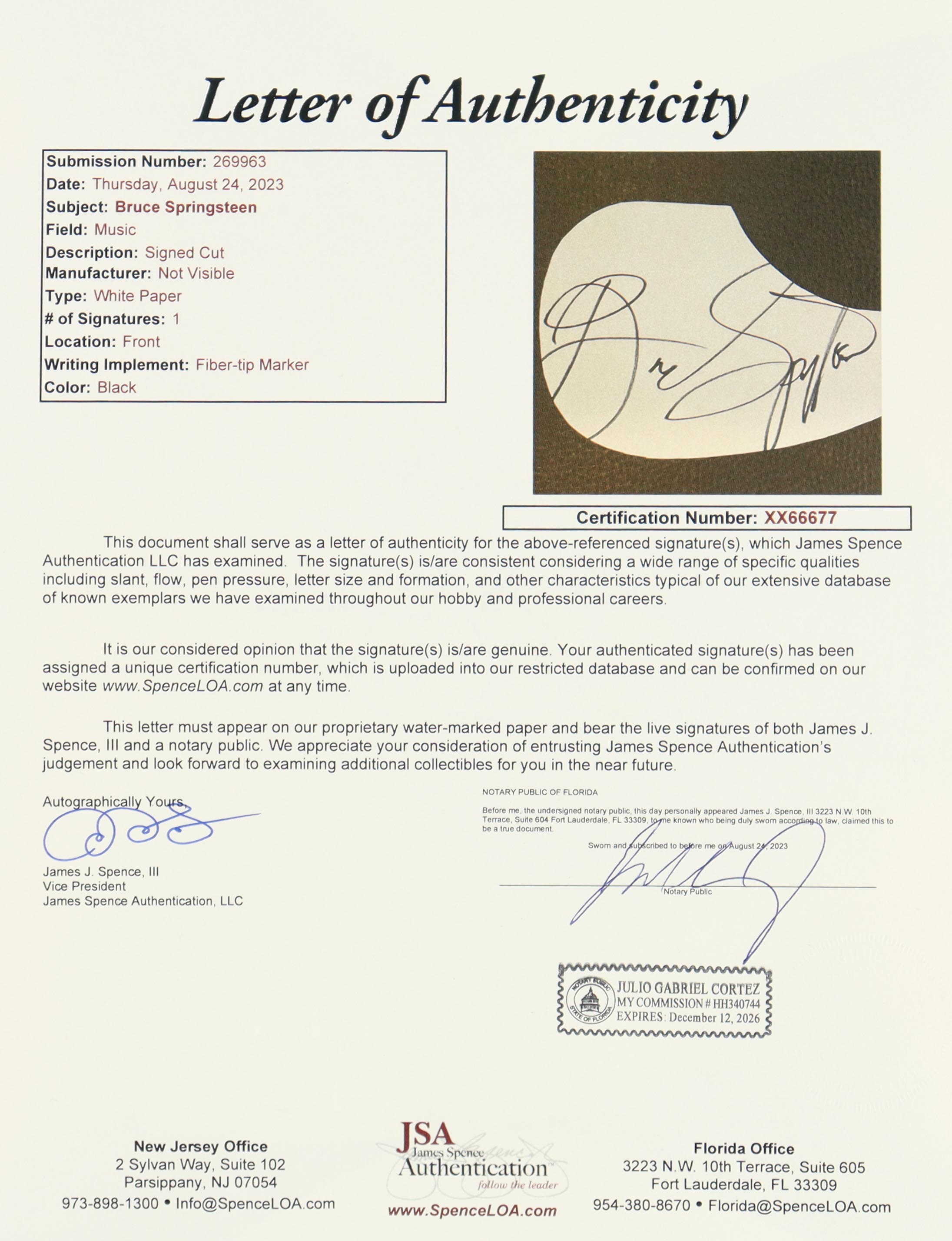 The autograph includes an official James Spence Authentication (JSA) hologram and matching LOA for authenticity purposes.