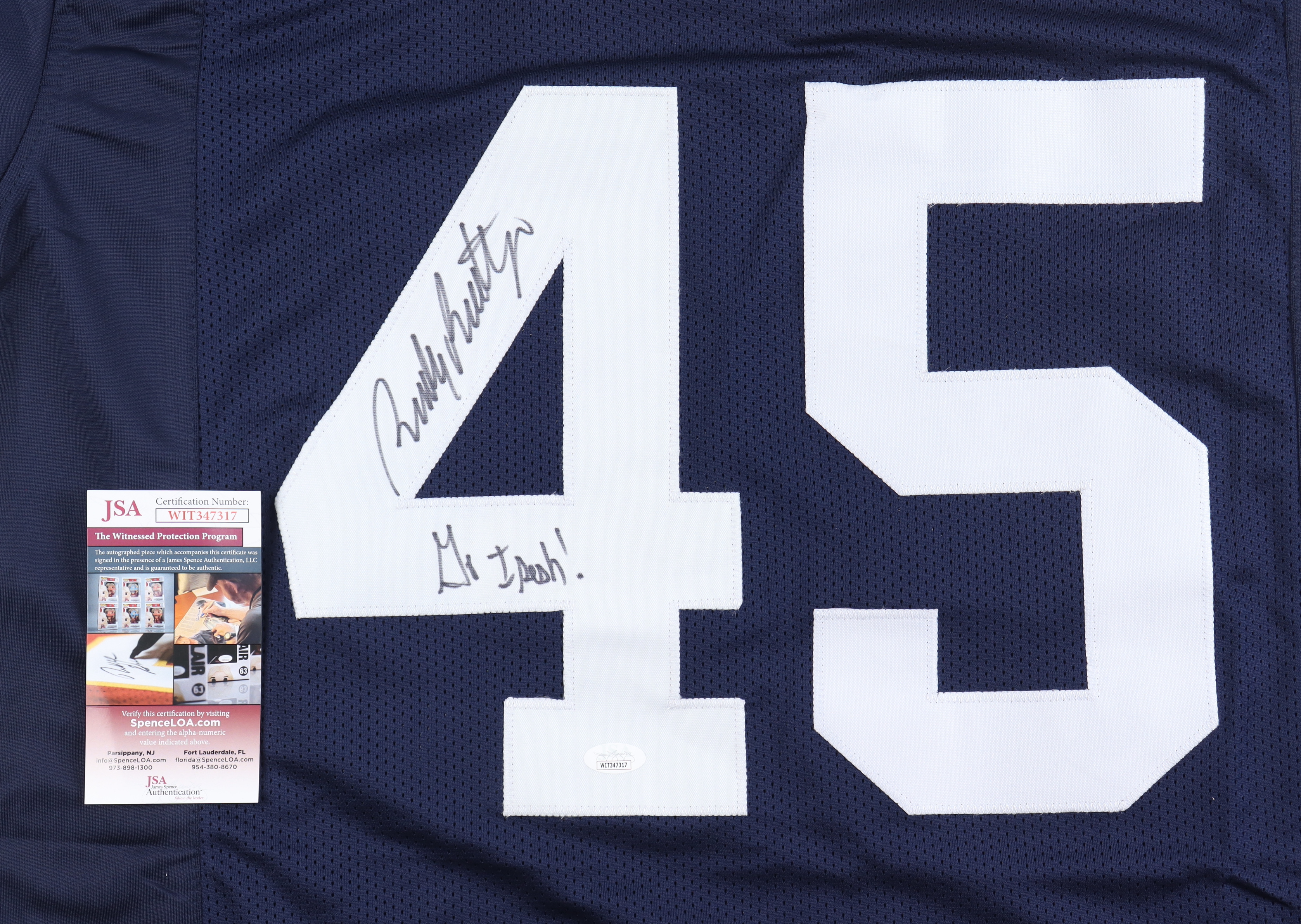 Custom jersey with everything sewn on, size XL. Hand-signed and inscribed by Rudy Ruettiger.