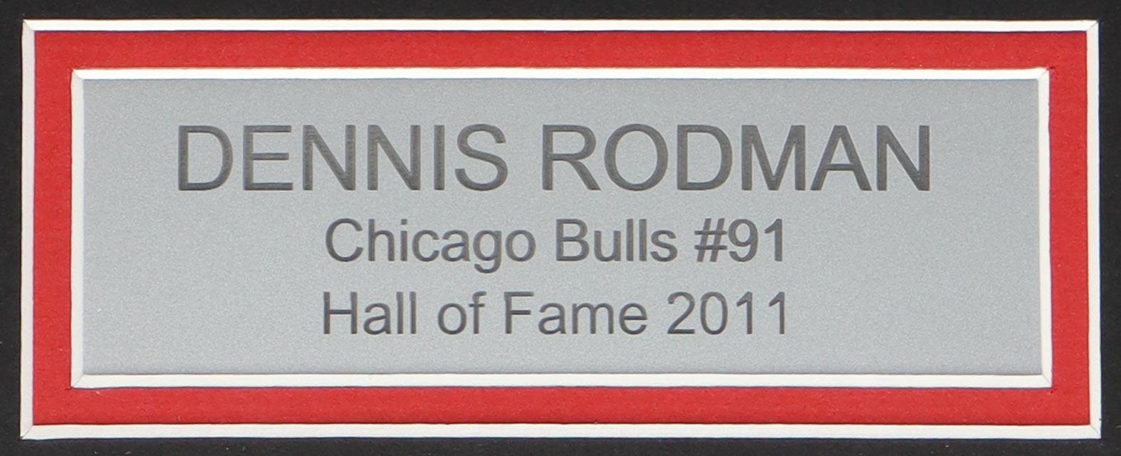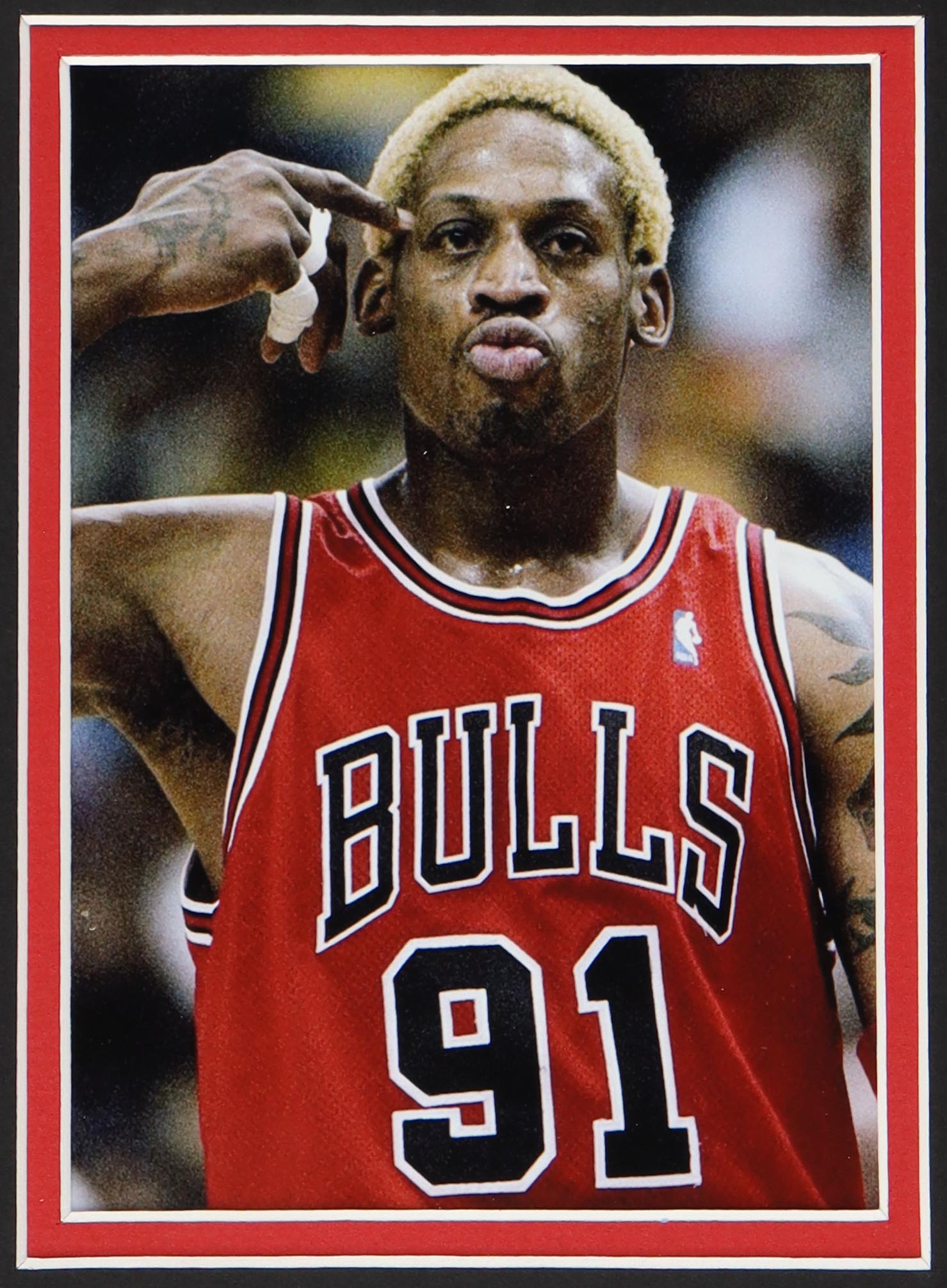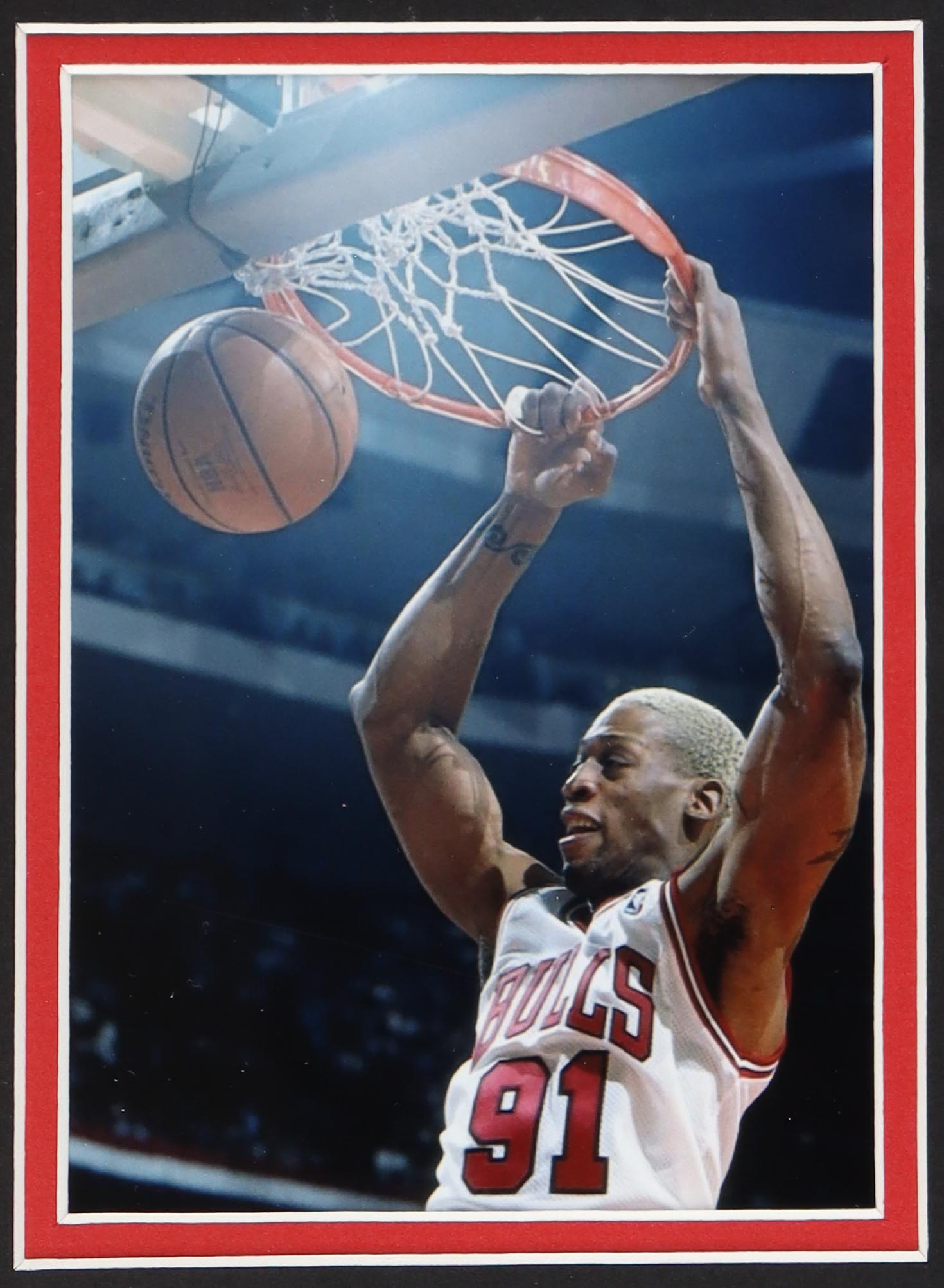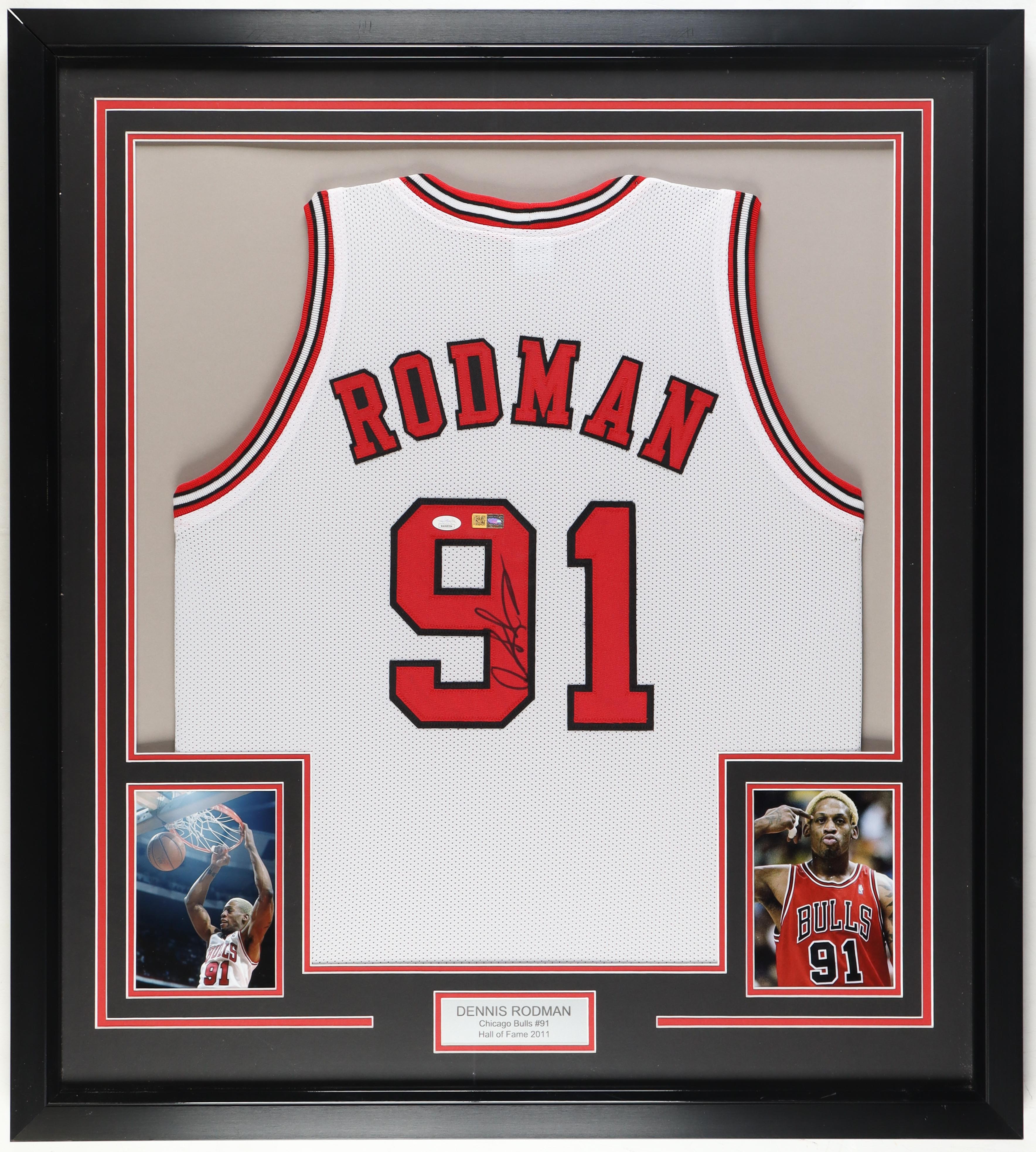 Custom frame measures approximately 35" x 39" in size and features a jersey that has been hand-signed by Dennis Rodman (HOF). Please note, there is scuffing on the frame.