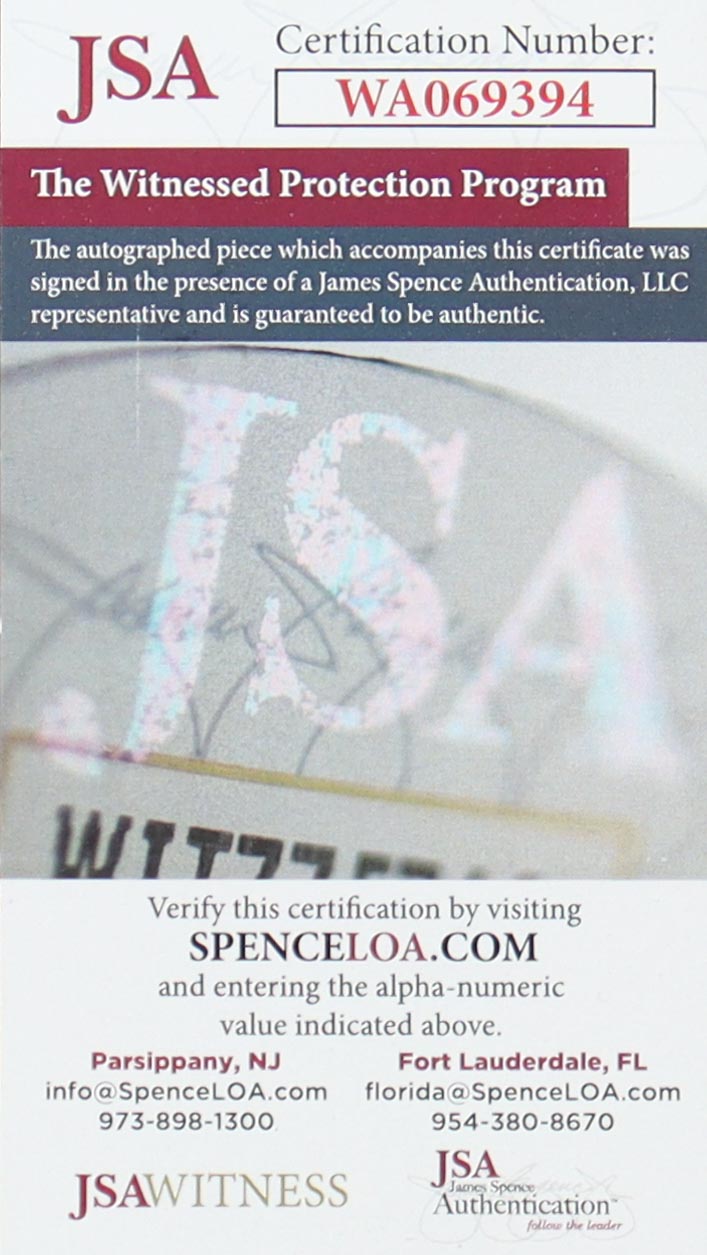 The autograph(s) includes an official James Spence Authentication (JSA) hologram and matching COA, an official Player's Ink hologram as well as an official Beckett Authentication Services hologram and matching LOA for authenticity purposes. The signing of this item was witnessed by JSA.
