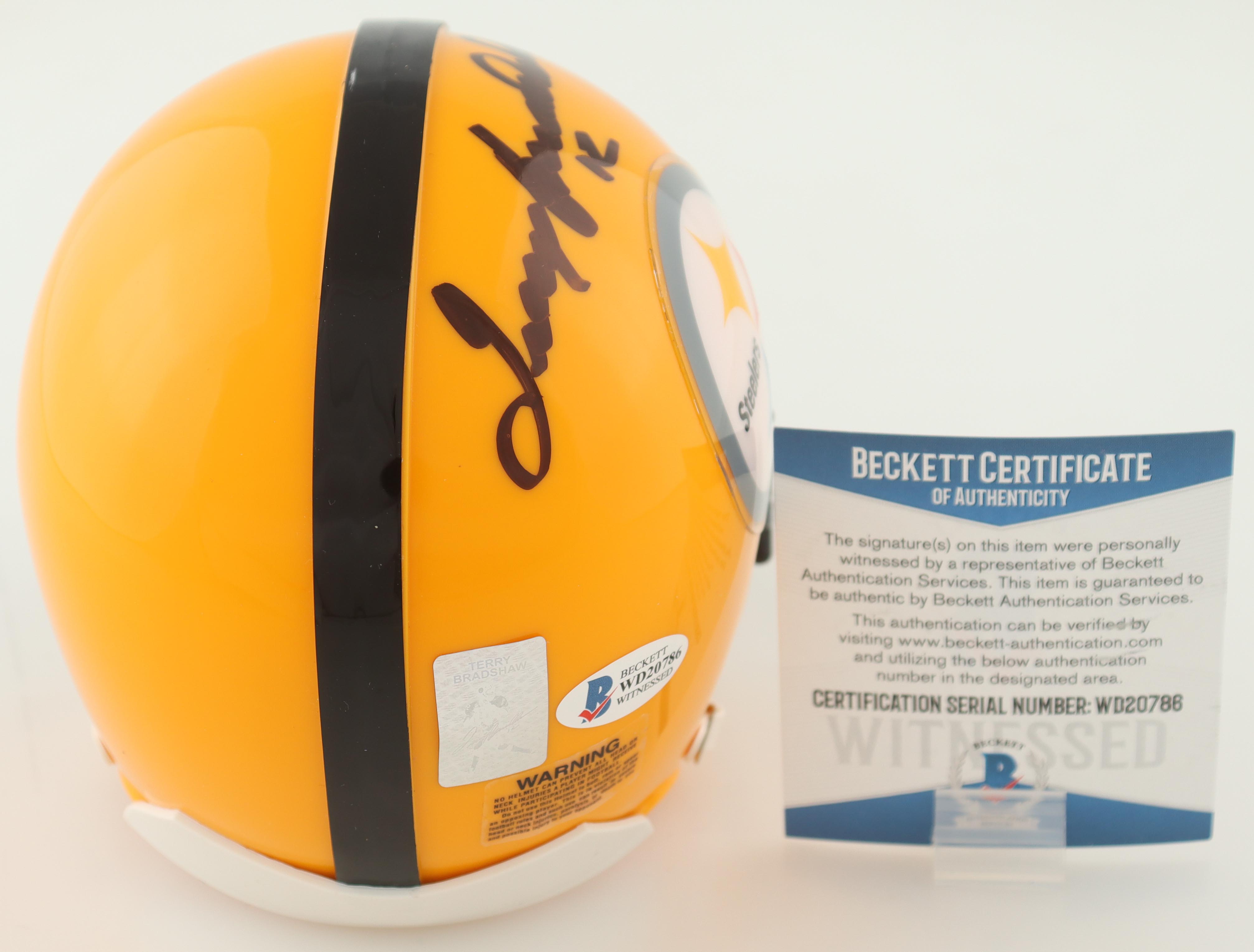 The autograph includes an official Beckett Authentication Services serially-numbered hologram and matching COA as well as an official Terry Bradshaw player hologram for authenticity purposes. The signing of this item was witnessed by Beckett.