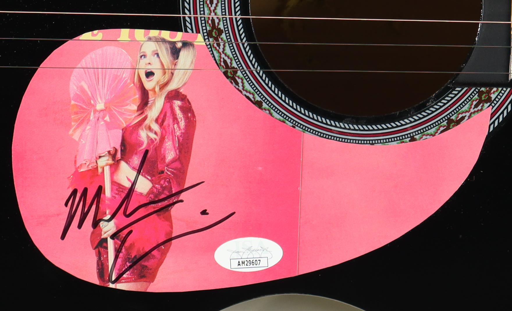 Guitar measures 38” in size has been hand-signed on the pick-guard by Meghan Trainor.