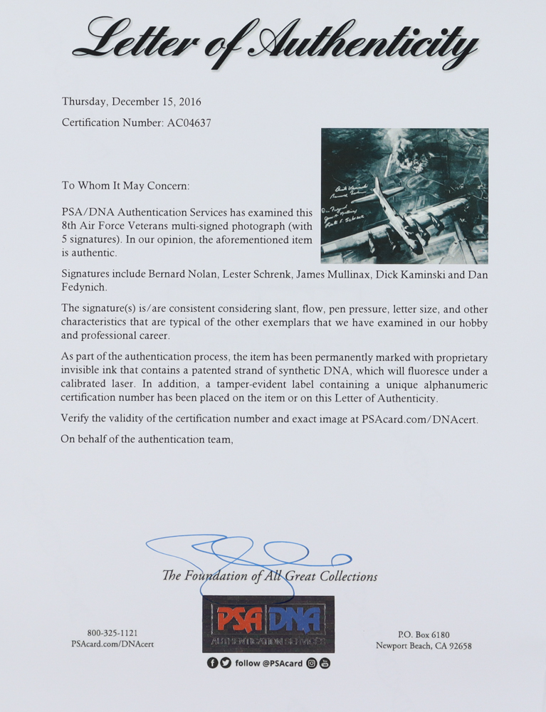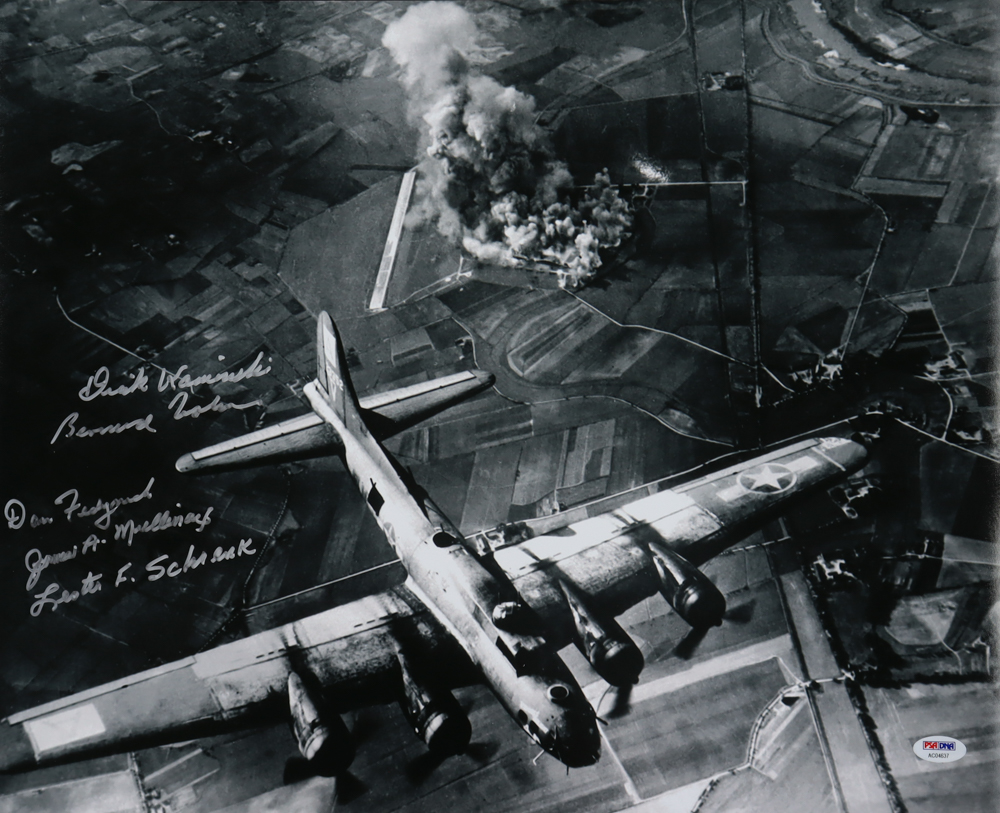 WWII 8th Air Force 16x20 Photo Signed by (5) with Bernard Nolan, Lester Schrenk, James Mullinax, Dick Kaminski (PSA)
