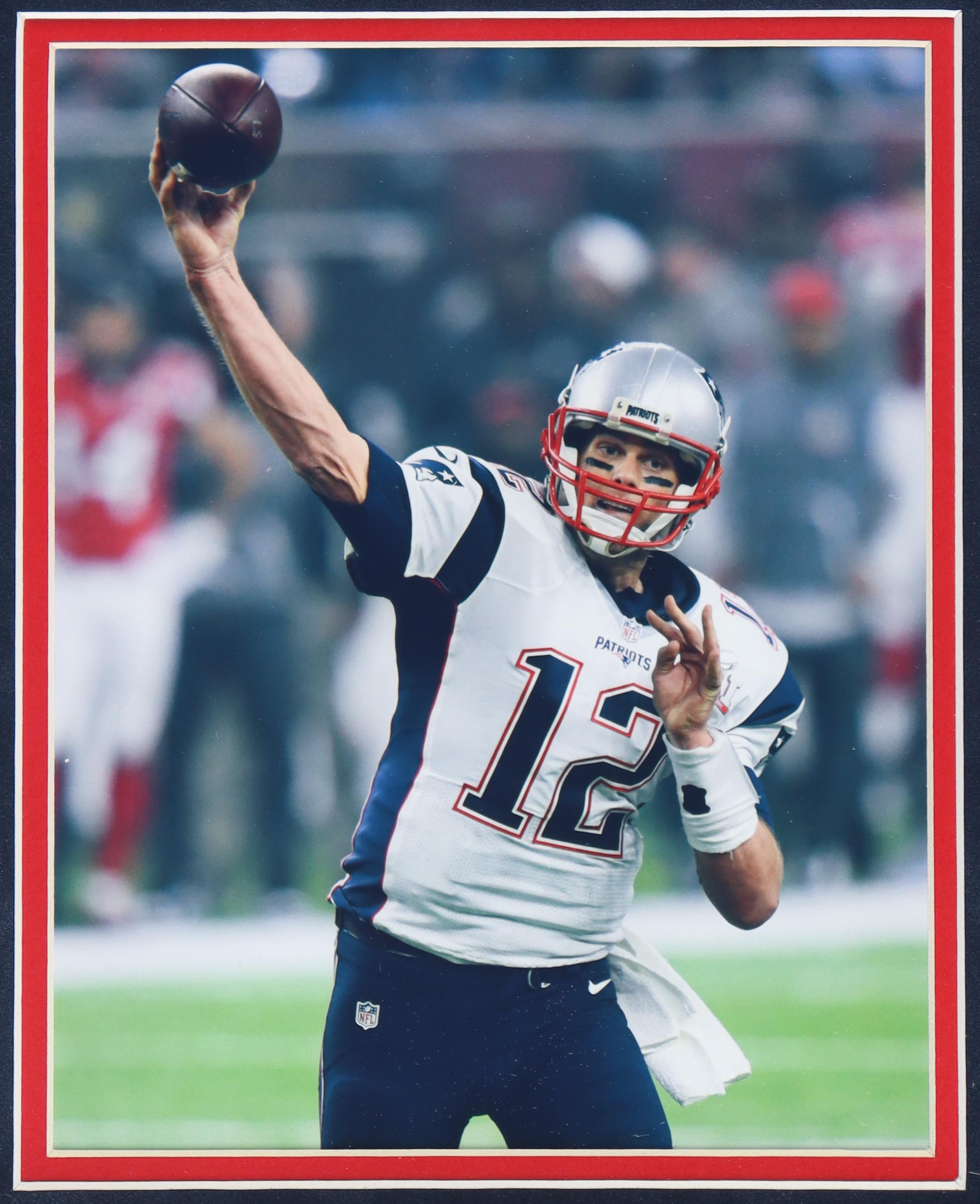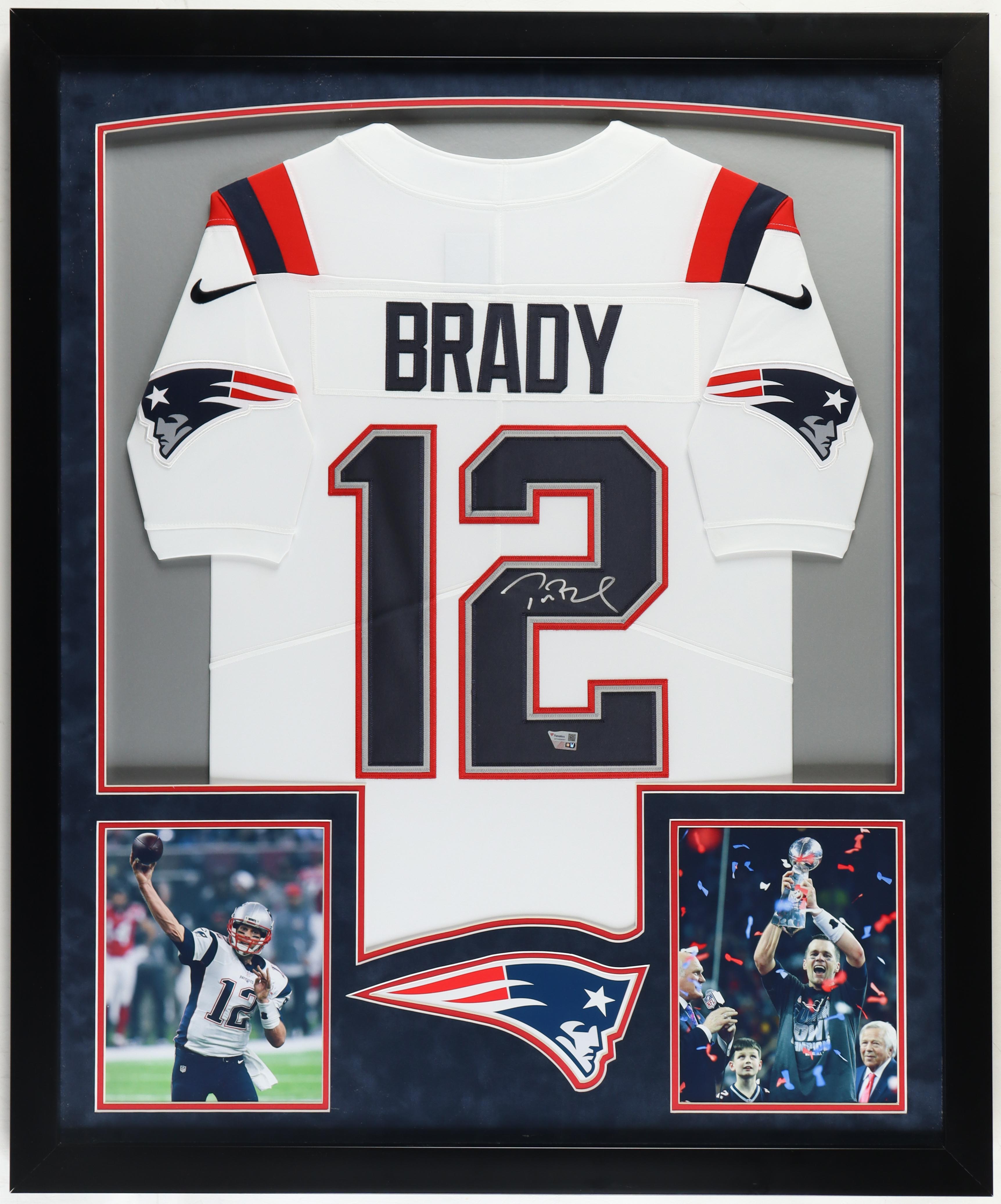 Custom frame measures 32.5" x 39.5" in size and comes installed with LED backlighting. The frame features a Nike Limited jersey that has been hand-signed by Tom Brady (New England Patriots).