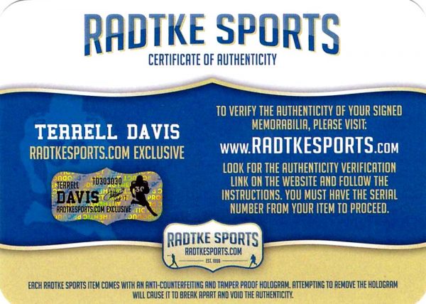 The lot / autograph(s) includes an official exclusive Terrell Davis hologram and COA from Radtke Sports. Also includes a proof picture from the signing.