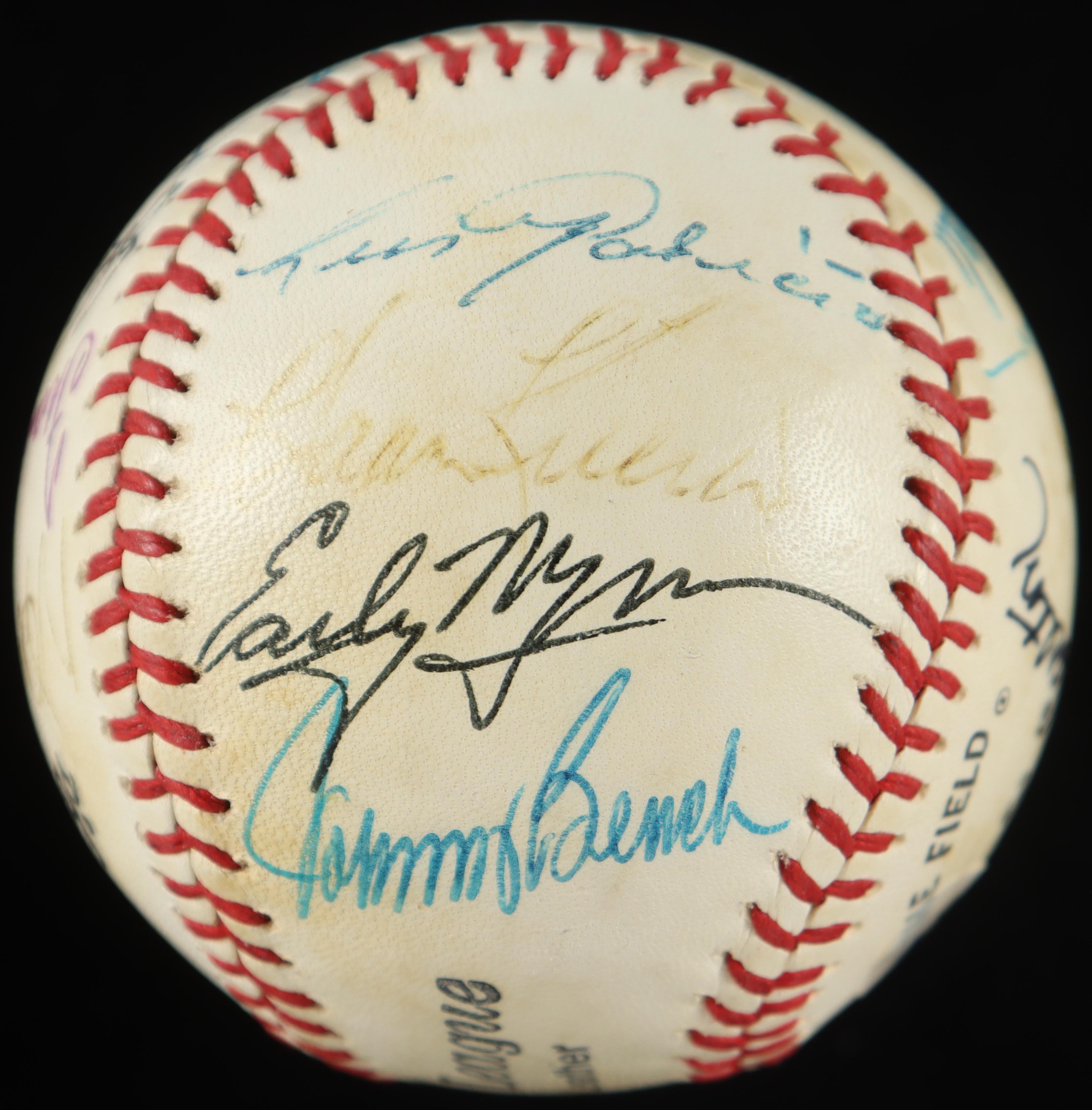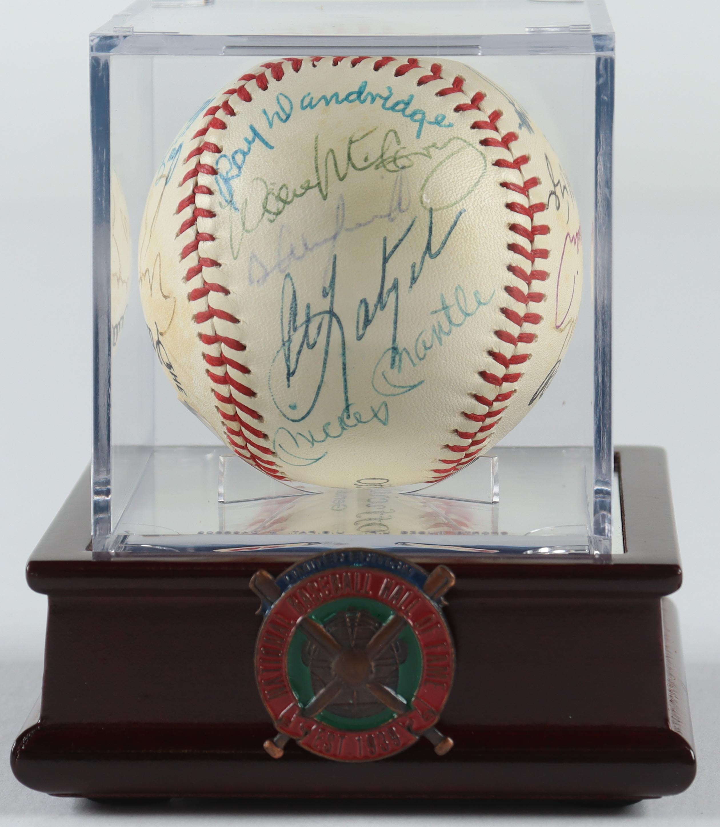 Rawlings Official League baseball, multi-signed by Hall of Famers (18). Signatures include Mickey Mantle, Don Drysdale, Ernie Banks, Lou Brock, Ray Dandridge, Harmon Killebrew, Johnny Mize, Joe Morgan, Hal Newhouser, Warren Spahn, Dave Winfield, Early Wynn, Carl Yastremski, Luis Aparicio, Johnny Bench, Steve Carlton, Willie McCovey & Frank Robinson. Display case features a "National Baseball Hall of Fame" pin. Please note, baseball is naturally toned. Refer to photos for condition of the baseball.