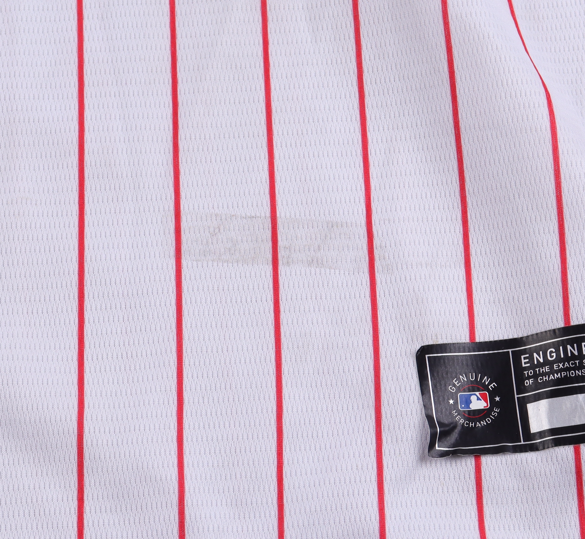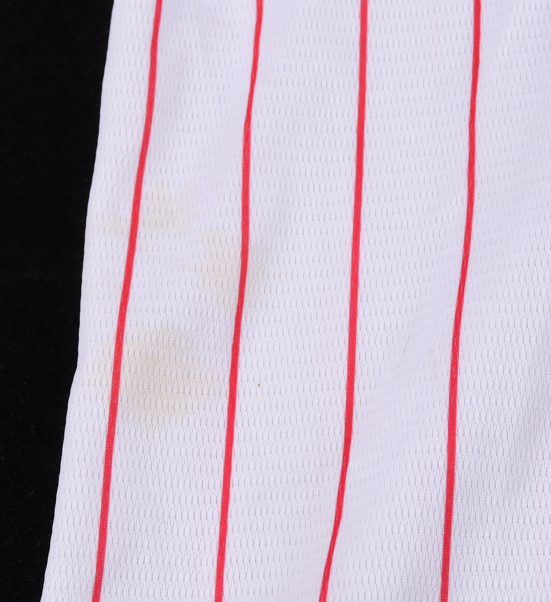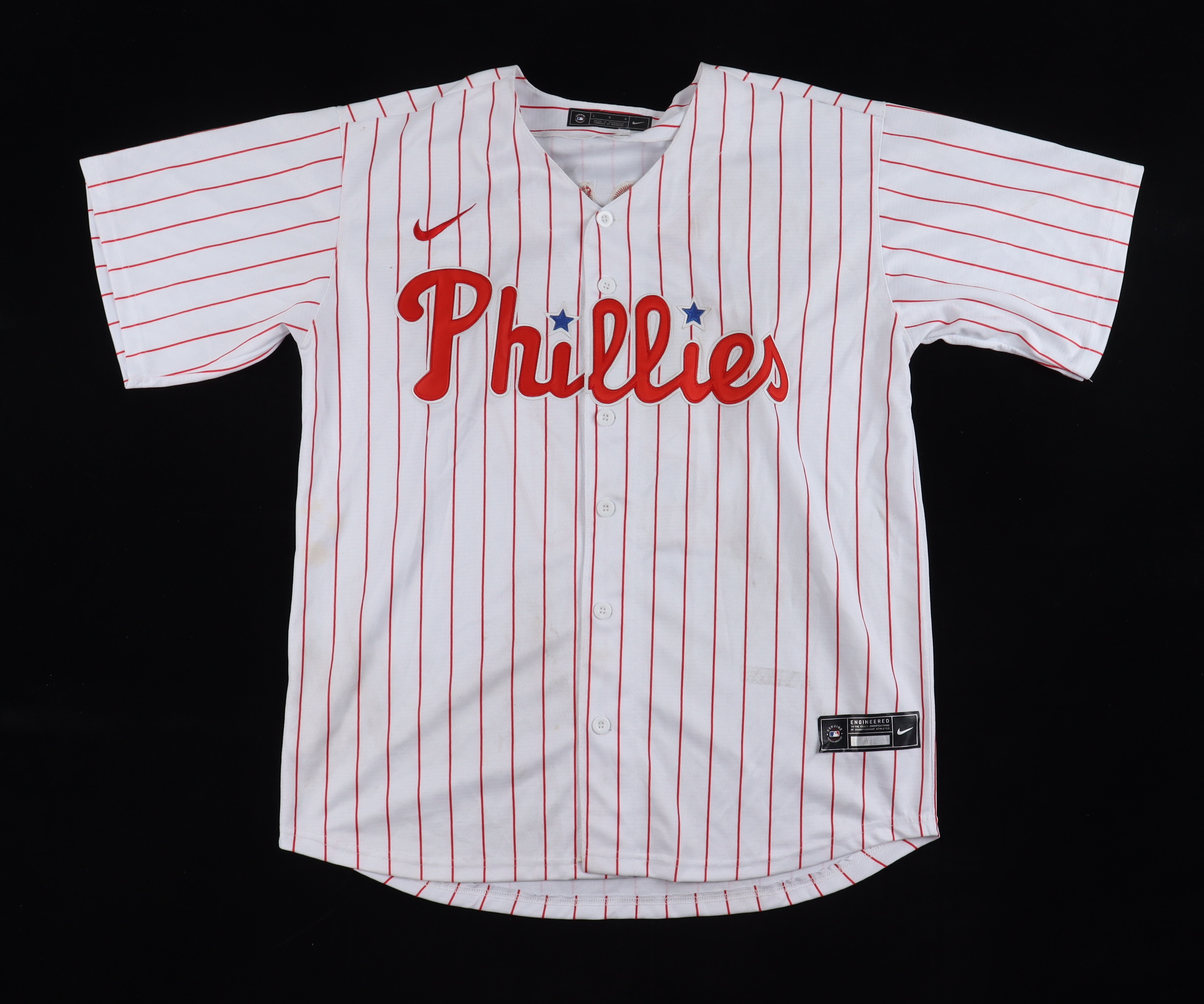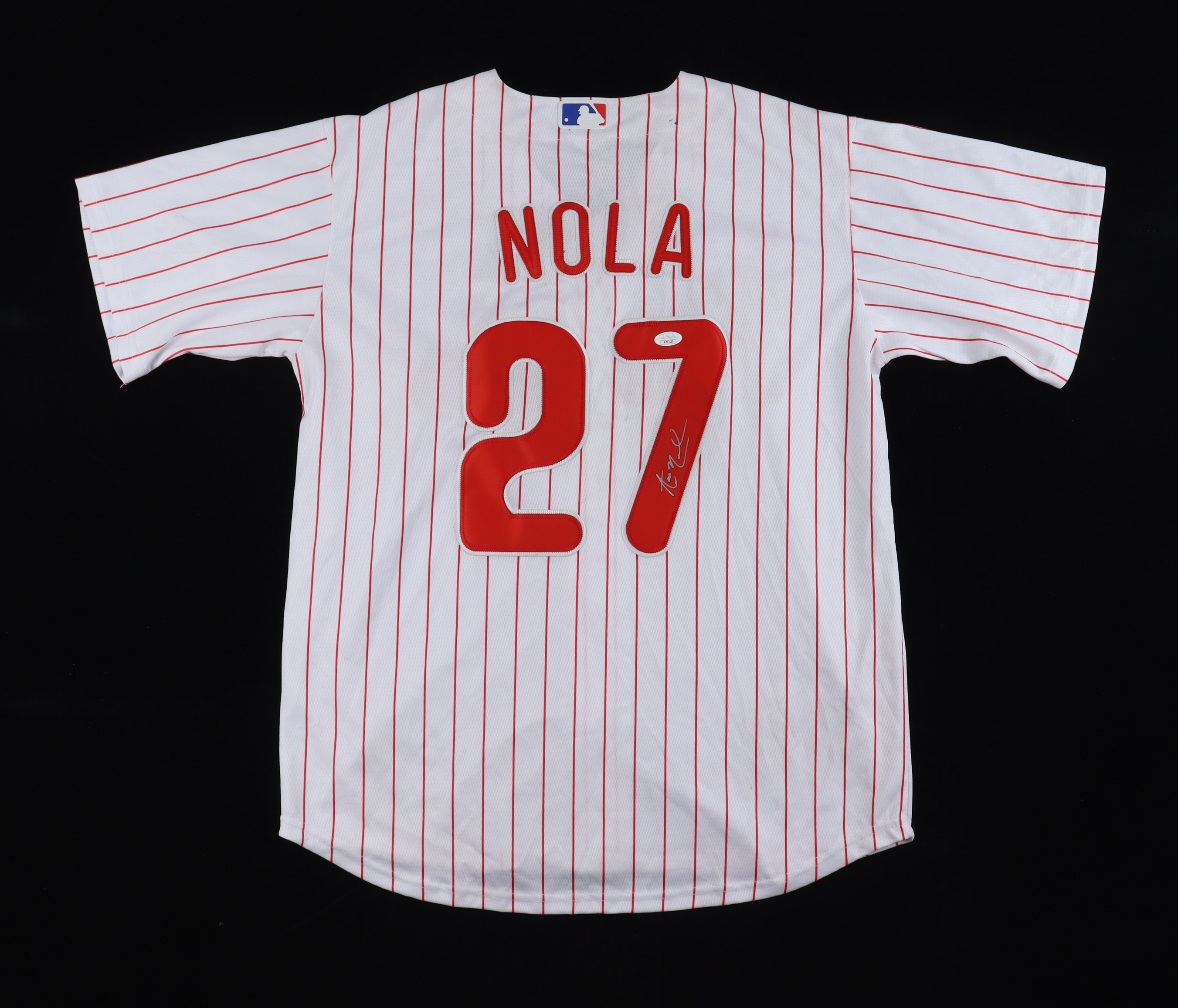 Custom jersey. Everything sewn on, size L. Hand-signed by Aaron Nola. Please note, there are multiple stains on the front and back of the jersey.