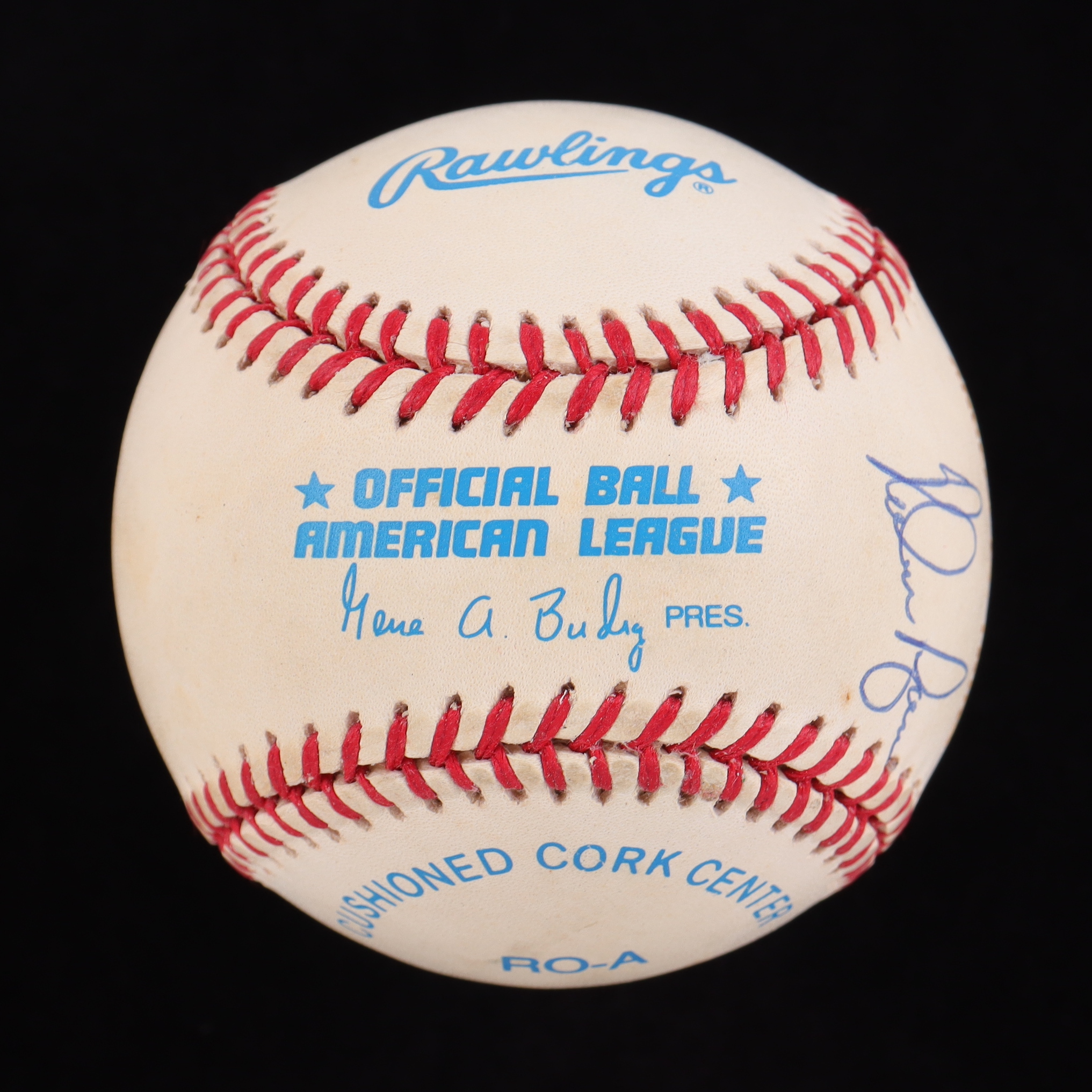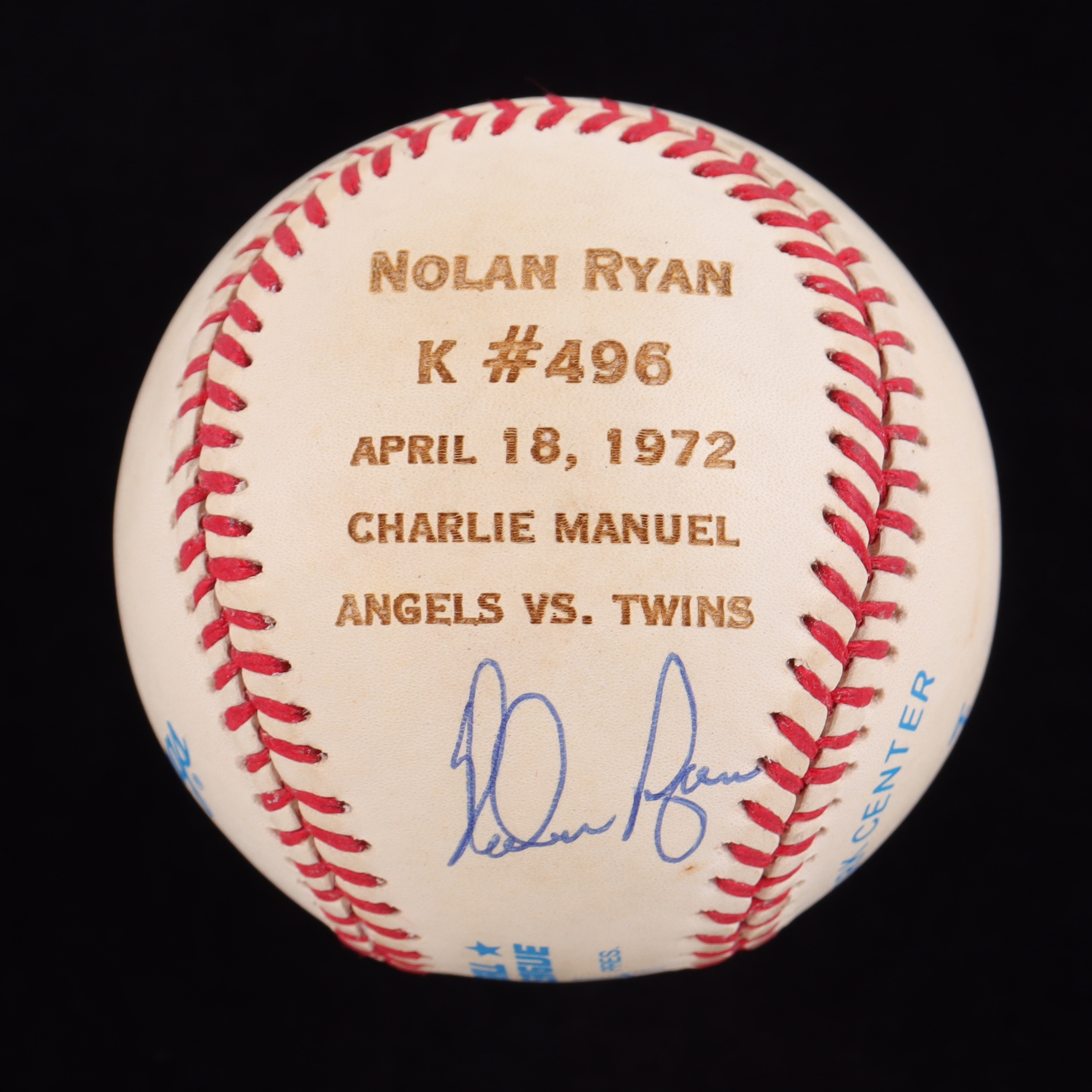 Rawlings Official American League custom engraved baseball that has been hand-signed by Nolan Ryan (Houston Astros, HOF). Ryan's #496 career strikeout record has been custom engraved into the baseball. Please note, the baseball is naturally toned.
