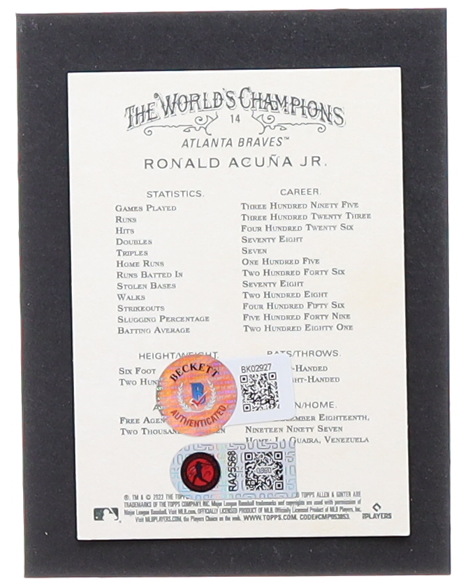 The autograph includes an official Beckett Authentication Services serially numbered hologram, as well as an official Ronald Acuna Jr. player hologram for authenticity purposes.