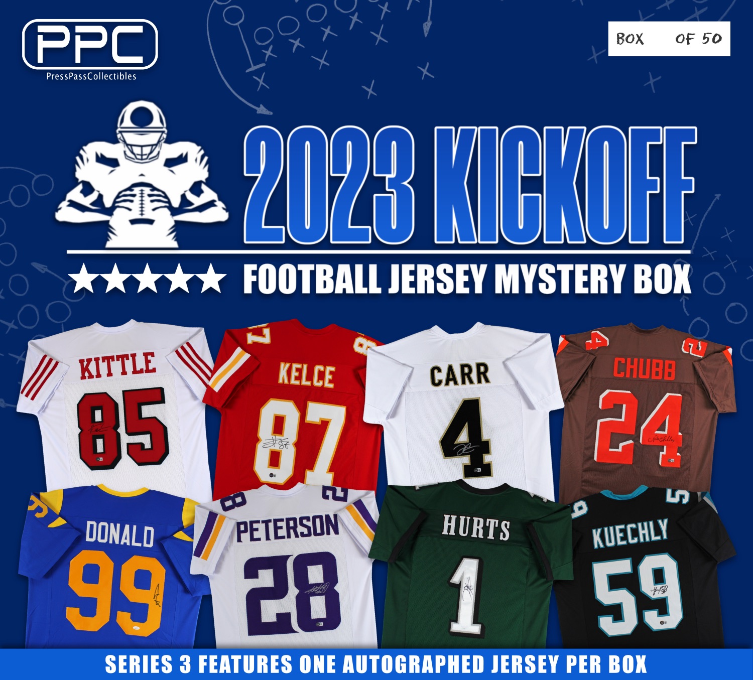 The Press Pass Collectibles 2023 kickoff football jersey mystery box includes one (1) custom jersey from your favorite NFL teams. Some boxes will feature jerseys signed by Derek Carr, Nick Chubb, Adrian Peterson, Luke Kuechly, and many more Stars / Hall of Famers!