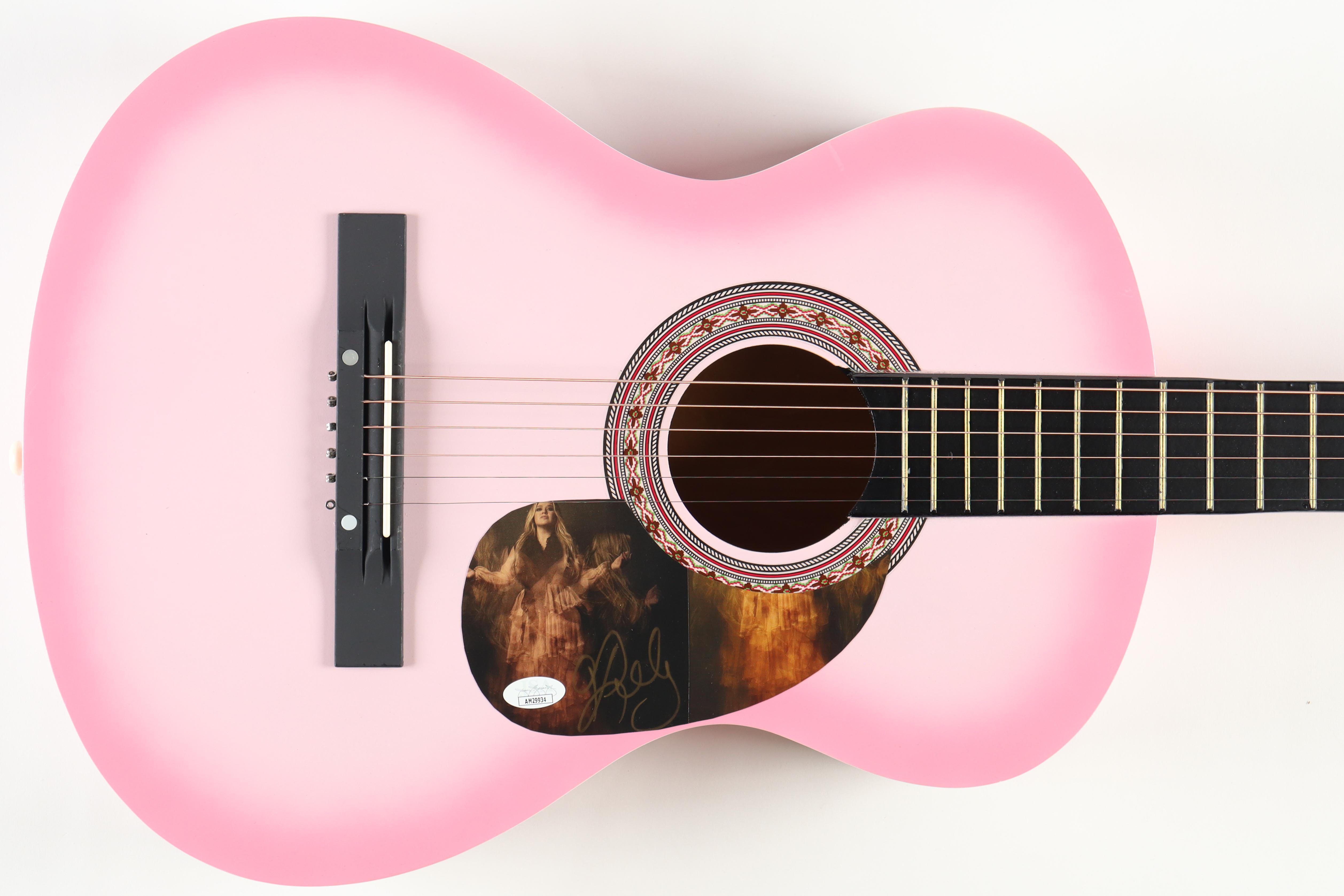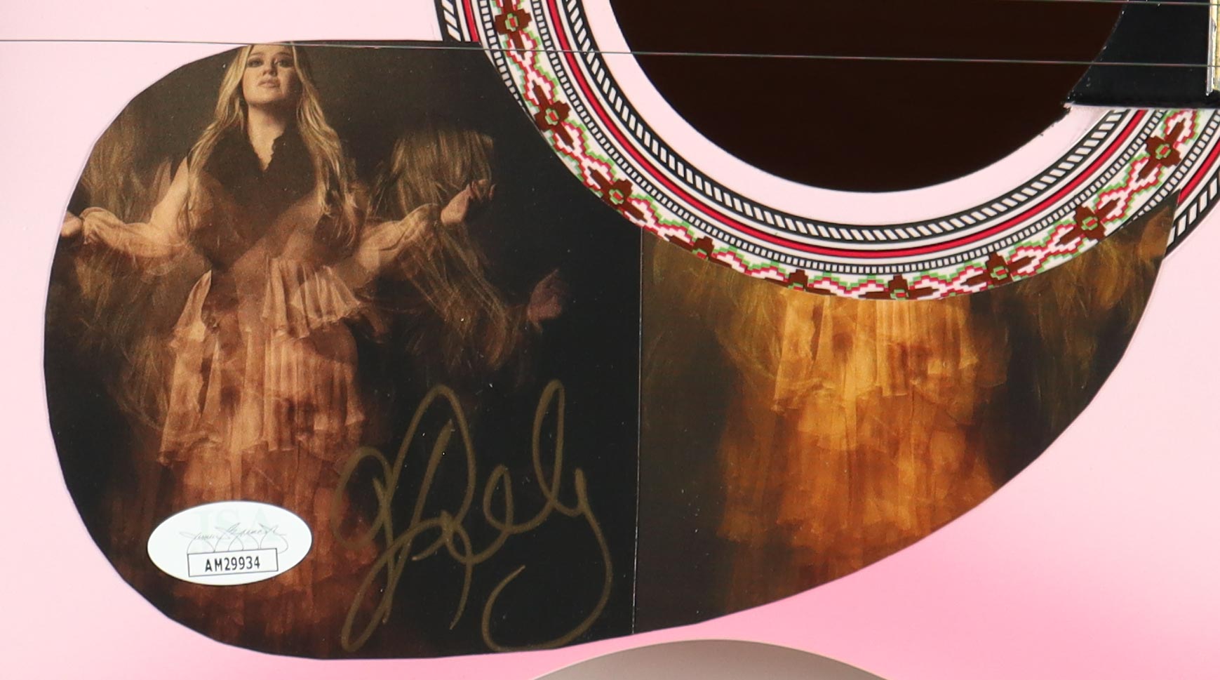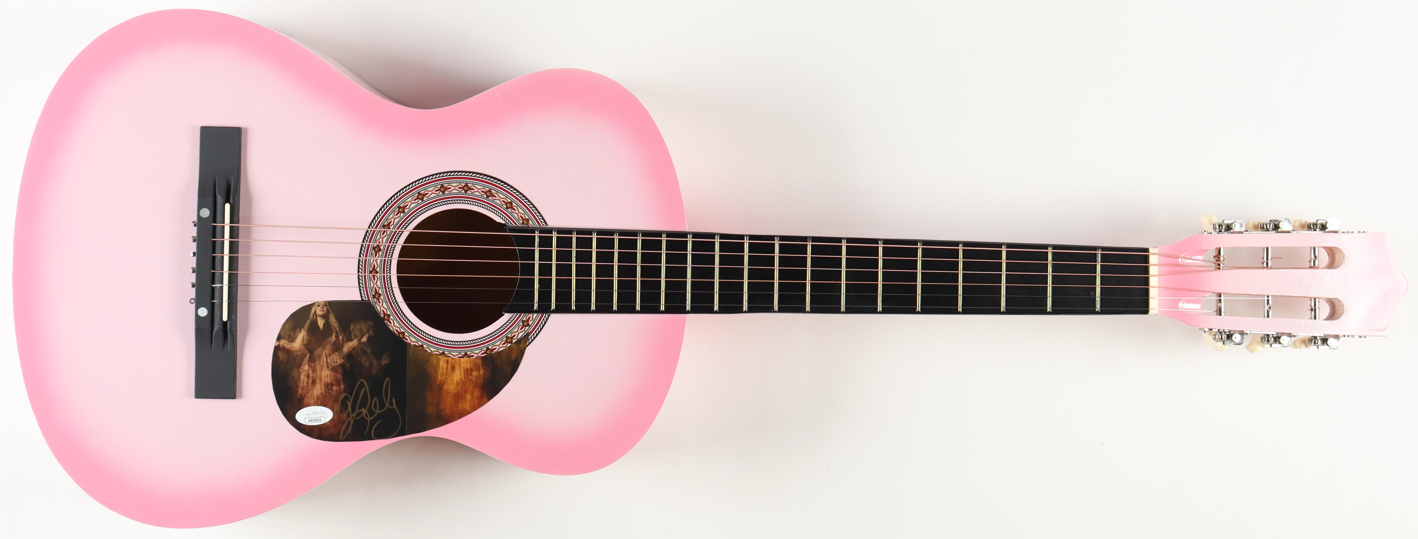 Acoustic Guitar measures 38” in size. Has been hand-signed on the pick-guard by Kelly Clarkson. This guitar is a display guitar. It is a lower-tier version and is not the same quality as one that a musician would play.