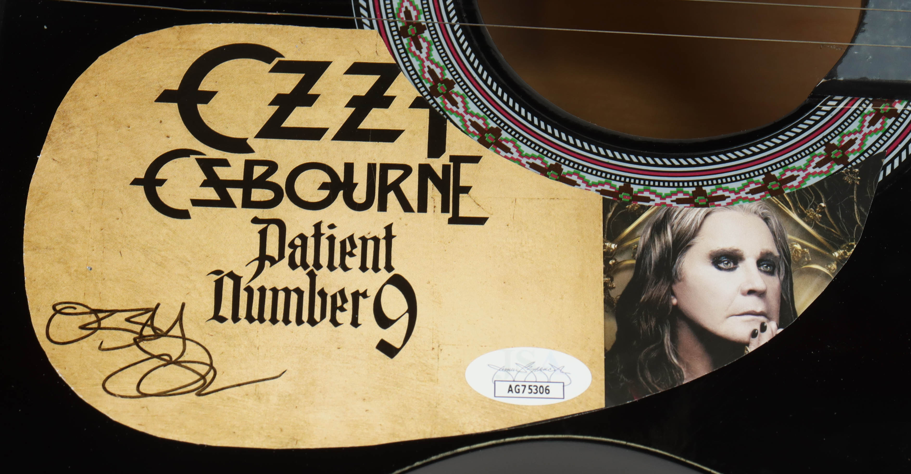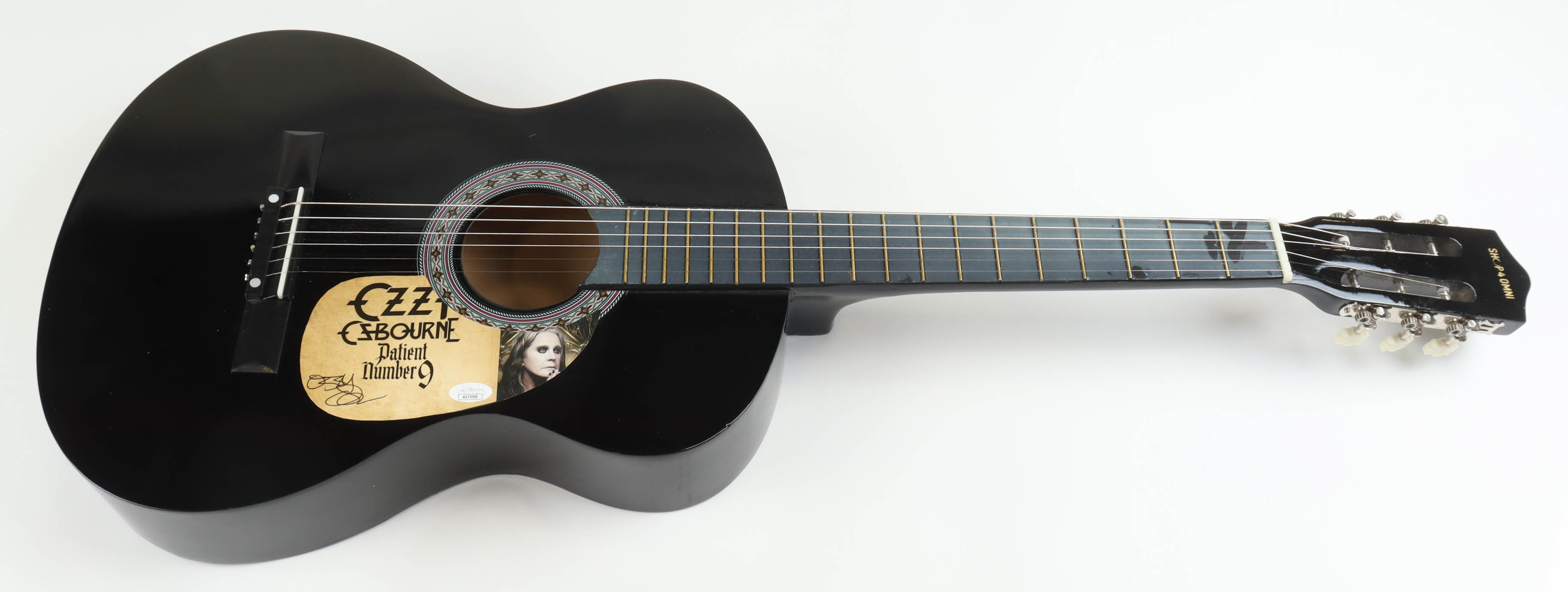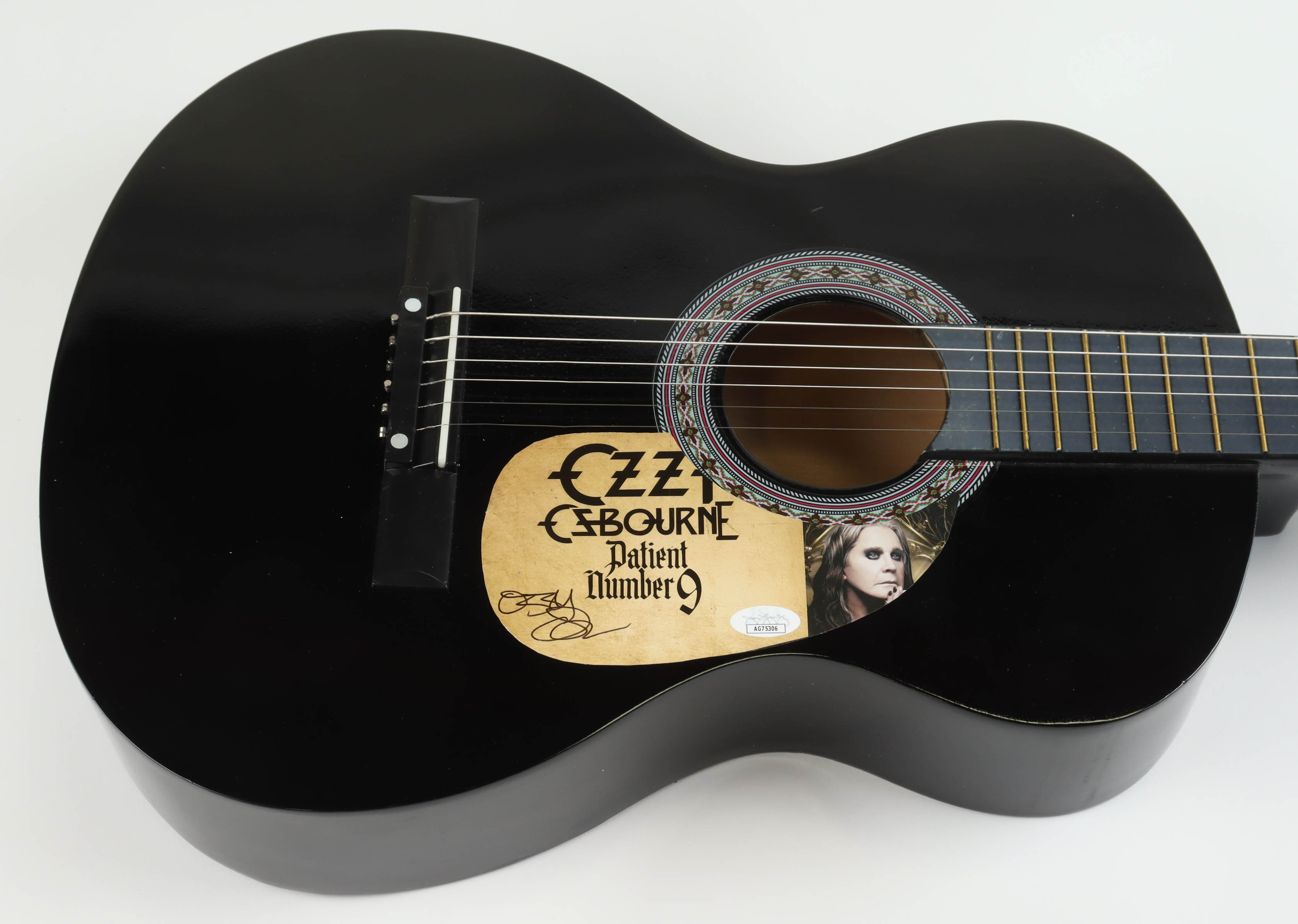 Acoustic guitar measures approximately 38" in length and has been hand-signed on a CD cover that has been repurposed as a pick-guard by Ozzy Osbourne. This guitar is a display guitar. It is a lower-tier version and is not the same quality as one that a musician would play.