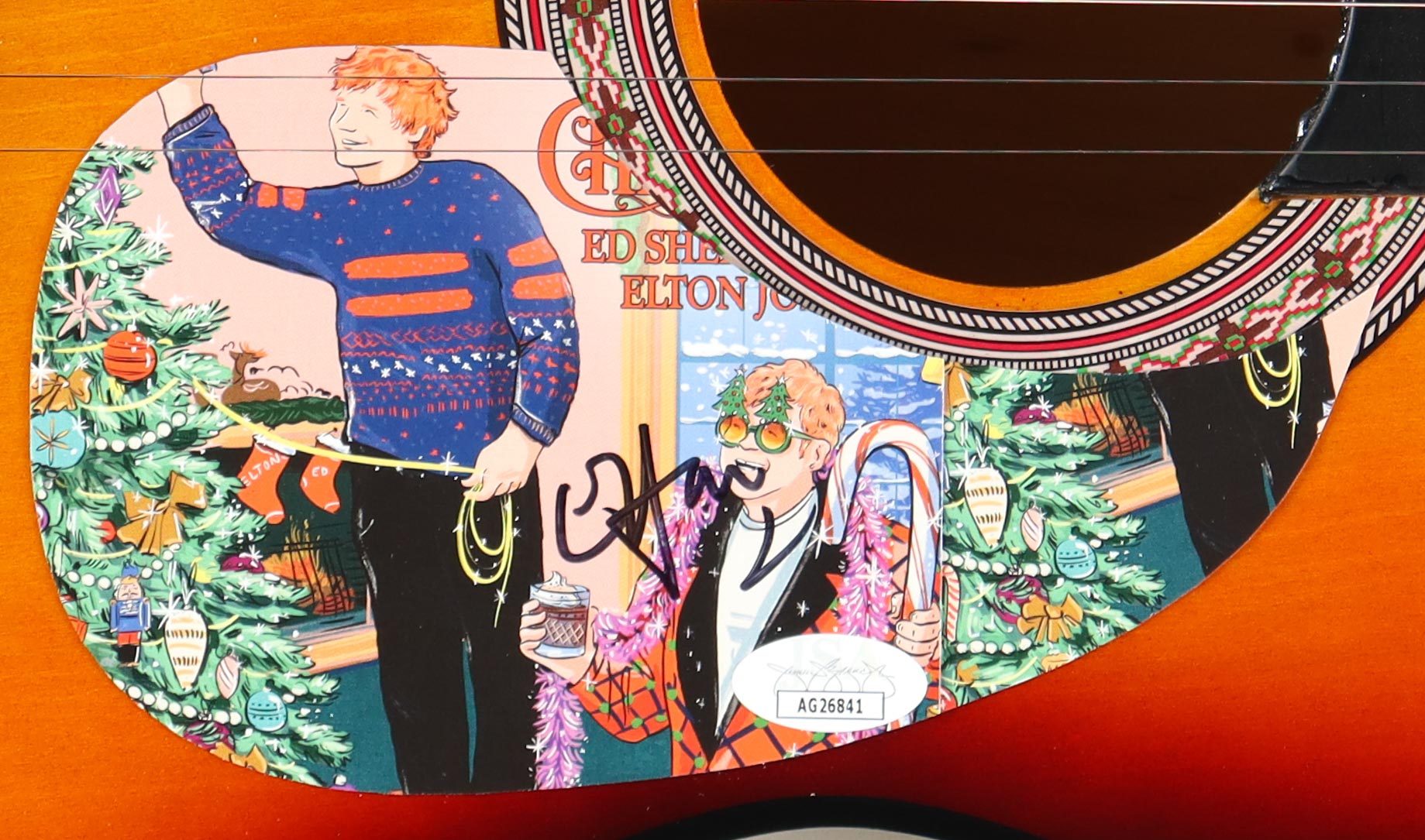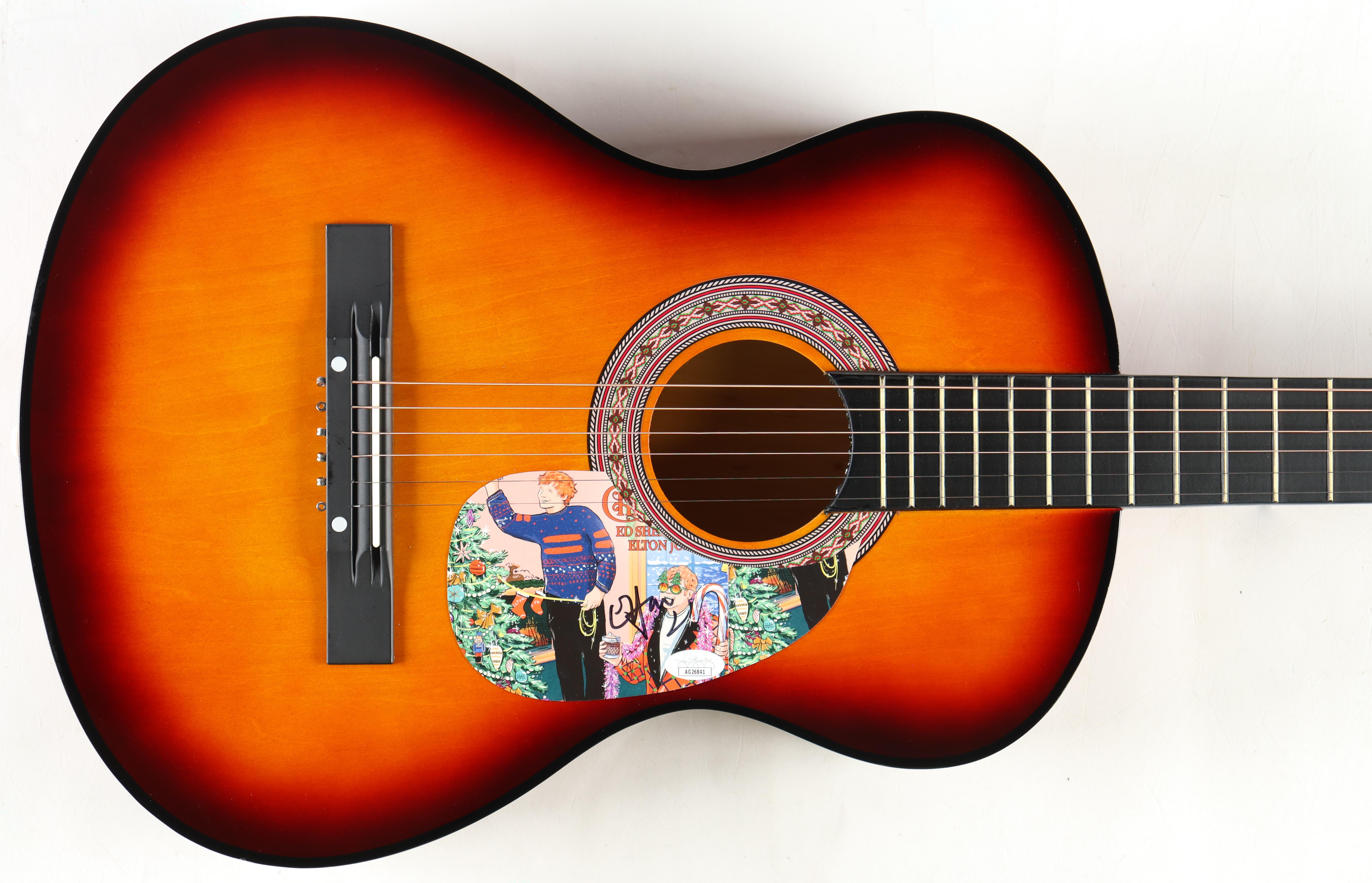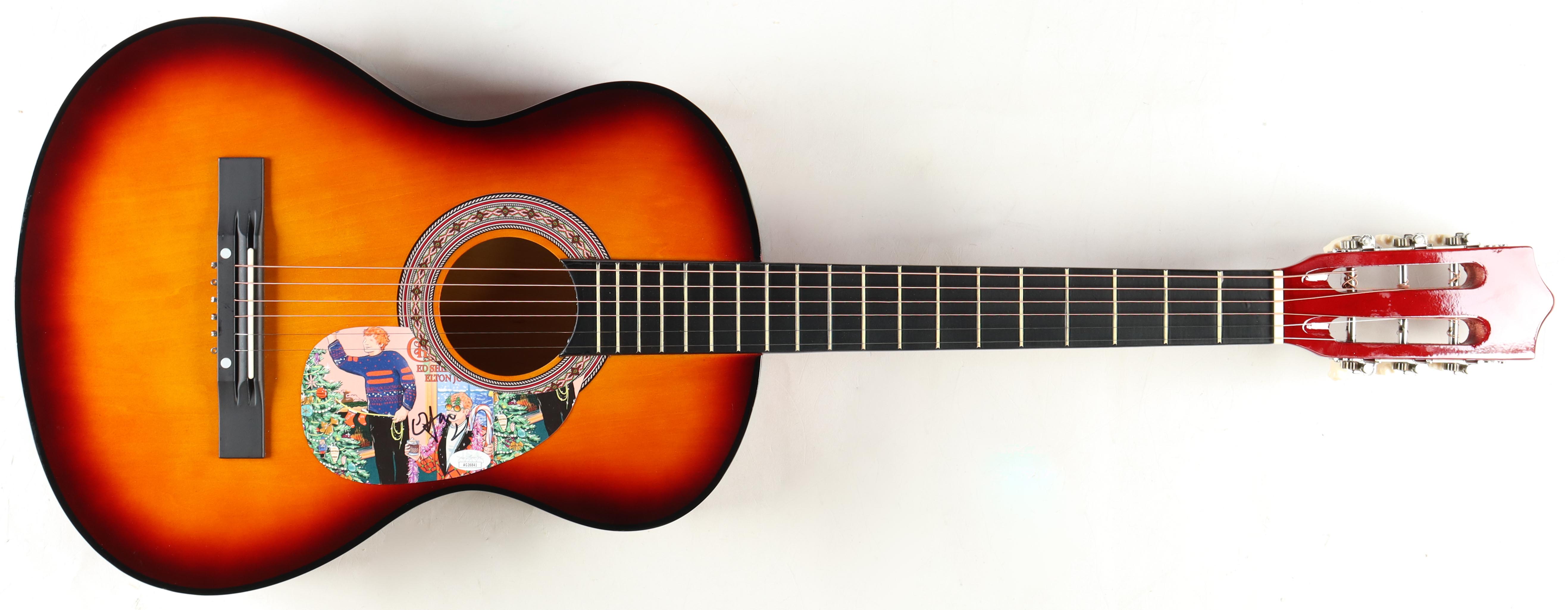 Acoustic guitar measures approximately 39" in length and has been hand-signed on the pick-guard by Elton John.