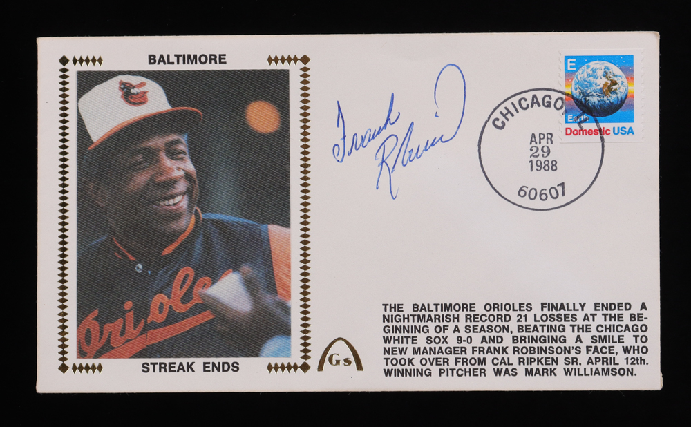 First Day Cover envelope dated April 29, 1988. Hand-signed by Frank Robinson (D. 2019, Baltimore Orioles, HOF).