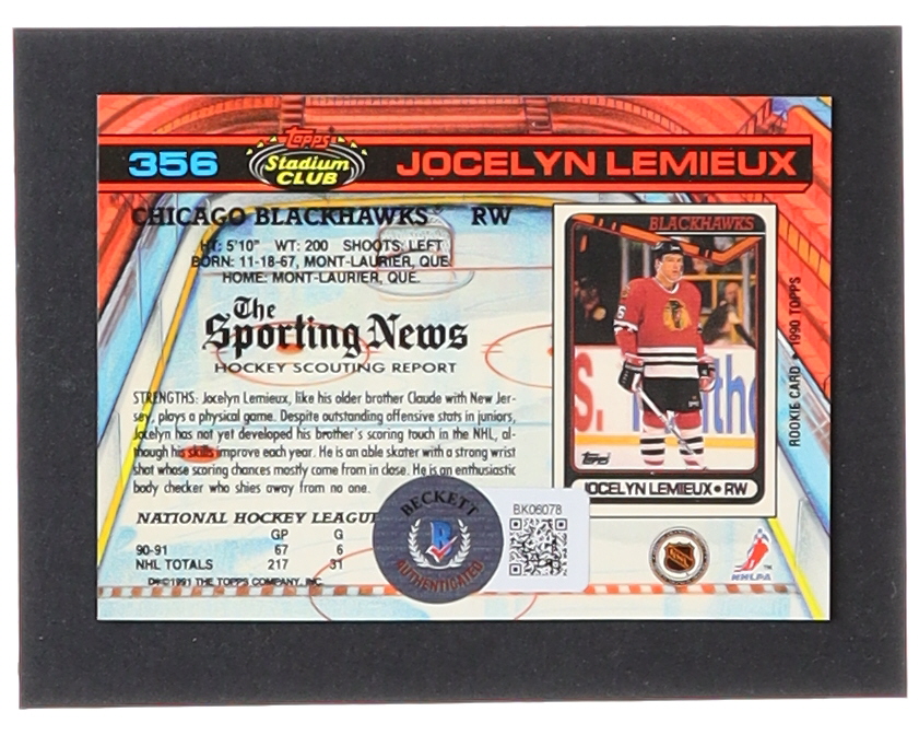 Jocelyn Lemieux Signed 1991-92 Stadium Club #356 (Beckett)