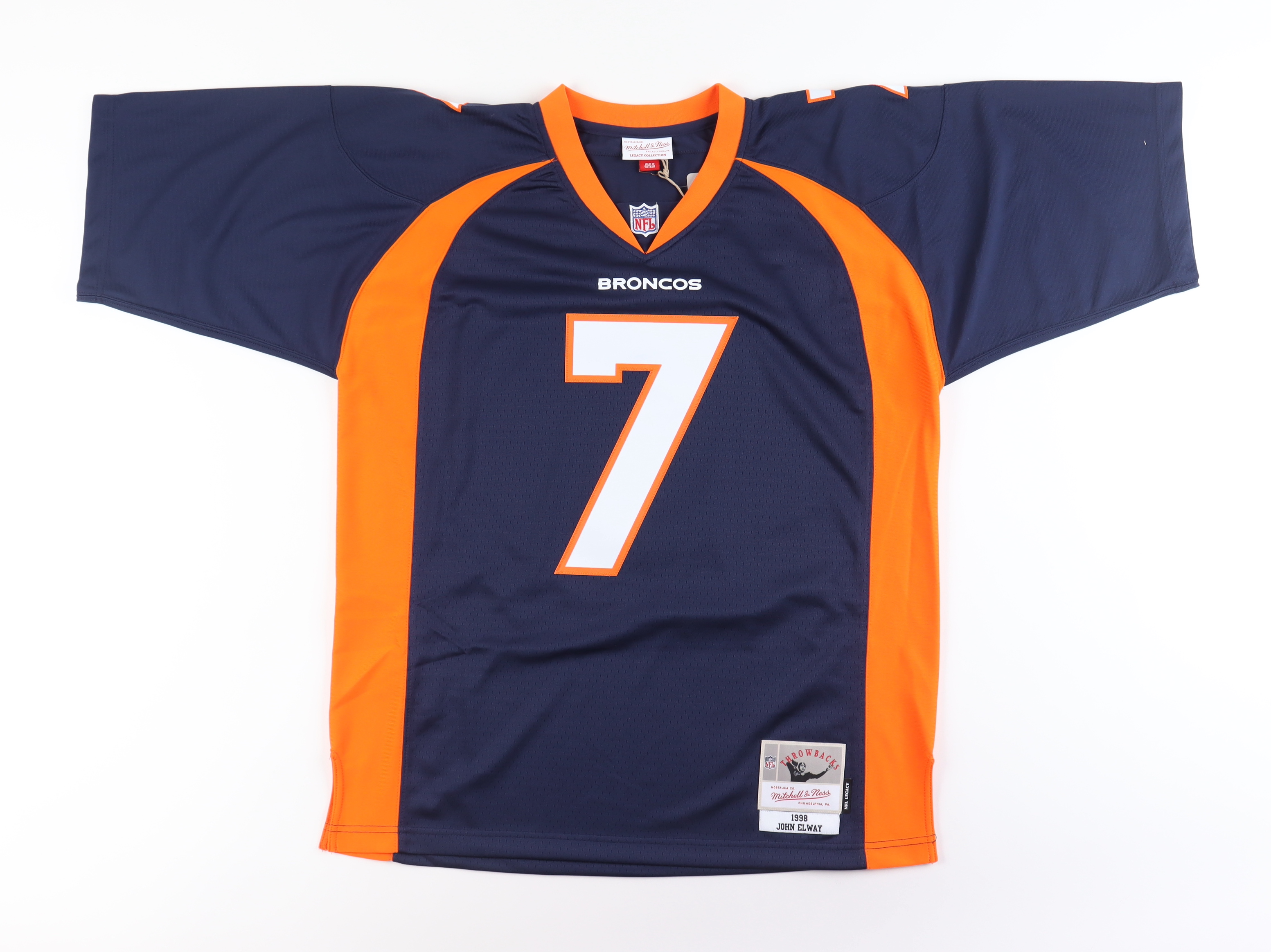 Mitchell & Ness jersey. Everything is sewn on, size L. Has been hand-signed by John Elway (Denver Broncos, HOF).