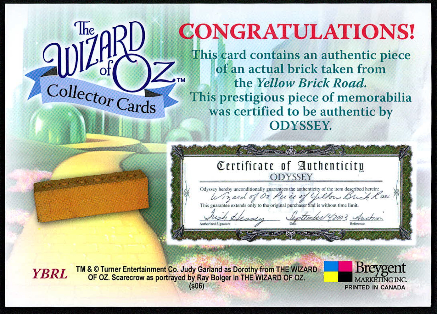 "The Wizard of Oz" LE 5x7 Prop Card with Authentic Piece of The Yellow Brick Road