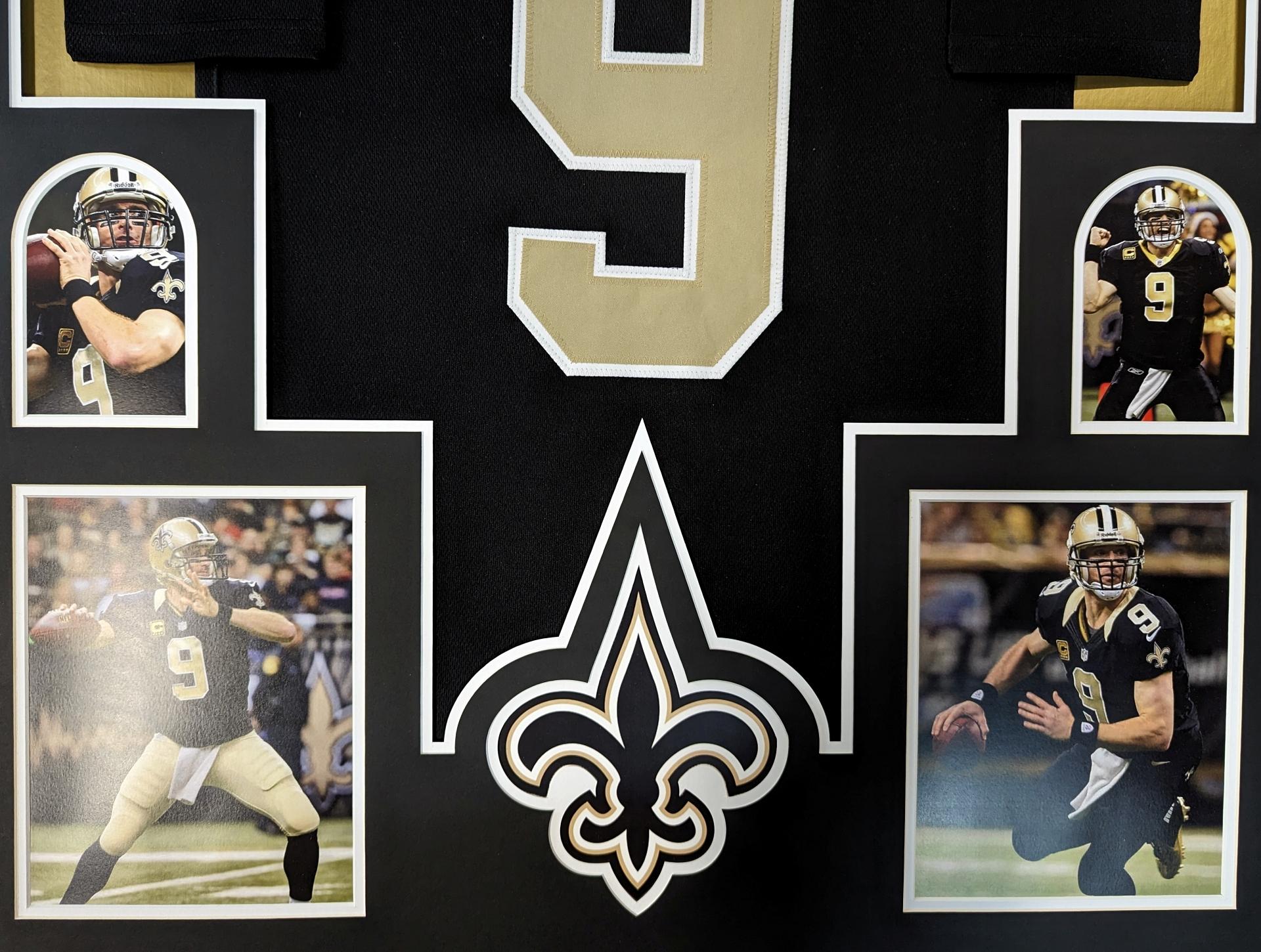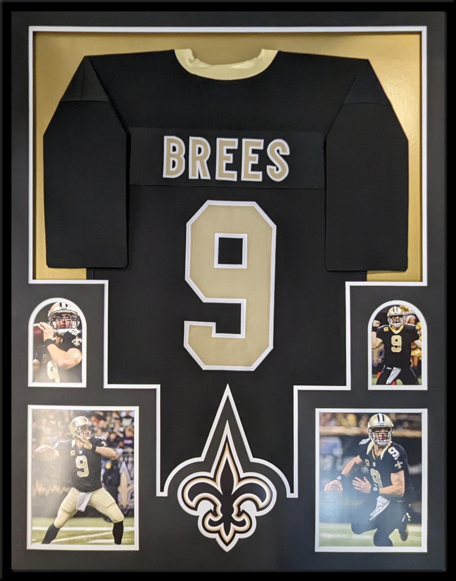 Custom framed display measures 34" x 42" in size and features a jersey of Drew Brees. Please note, the jersey is unsigned.