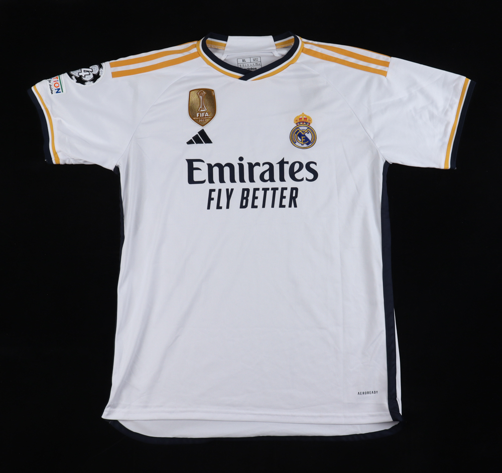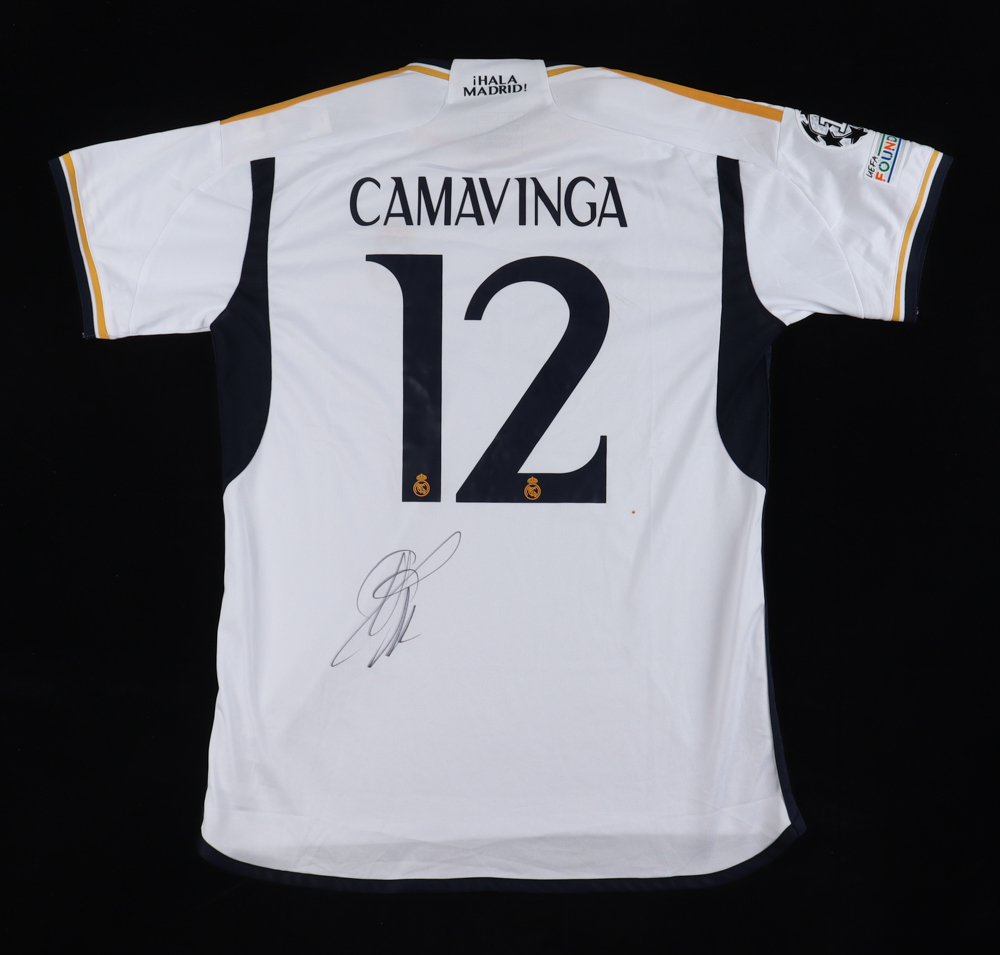 Adidas jersey with everything printed on, size XL. Hand-signed by Eduardo Camavinga (Real Madrid FC).