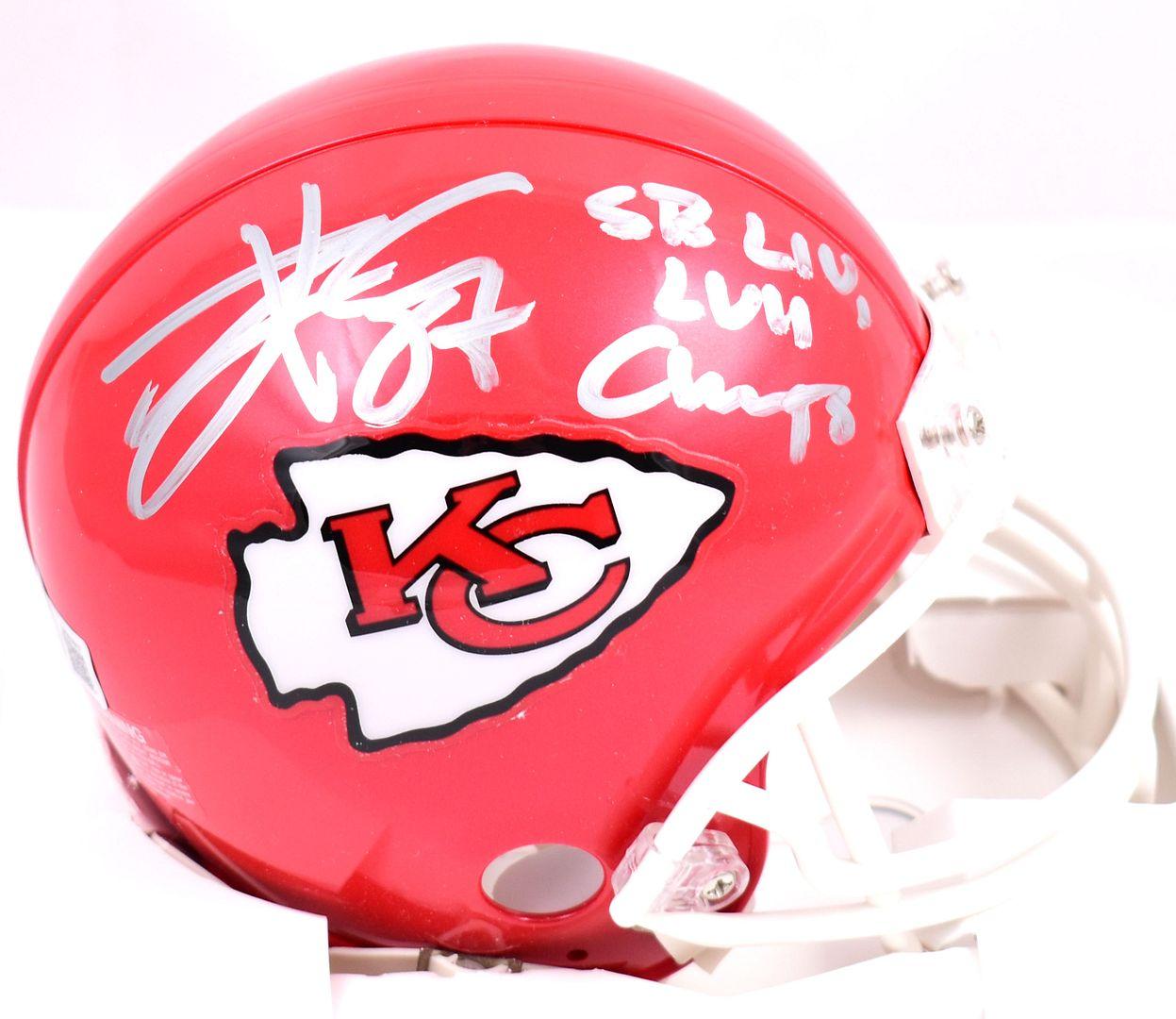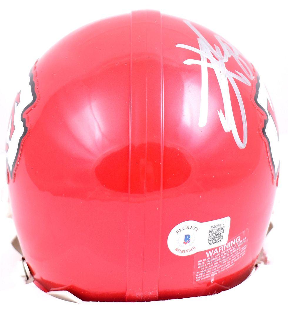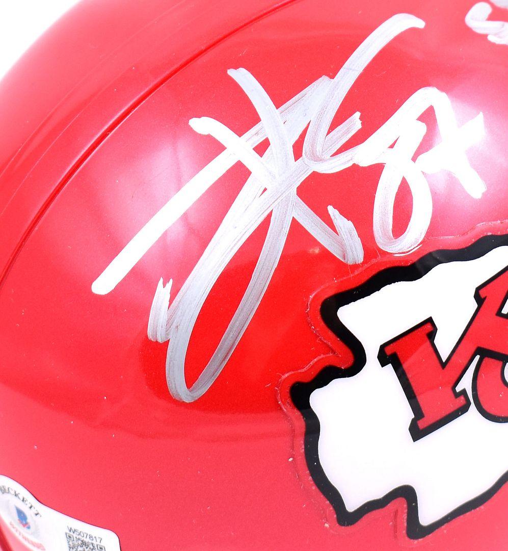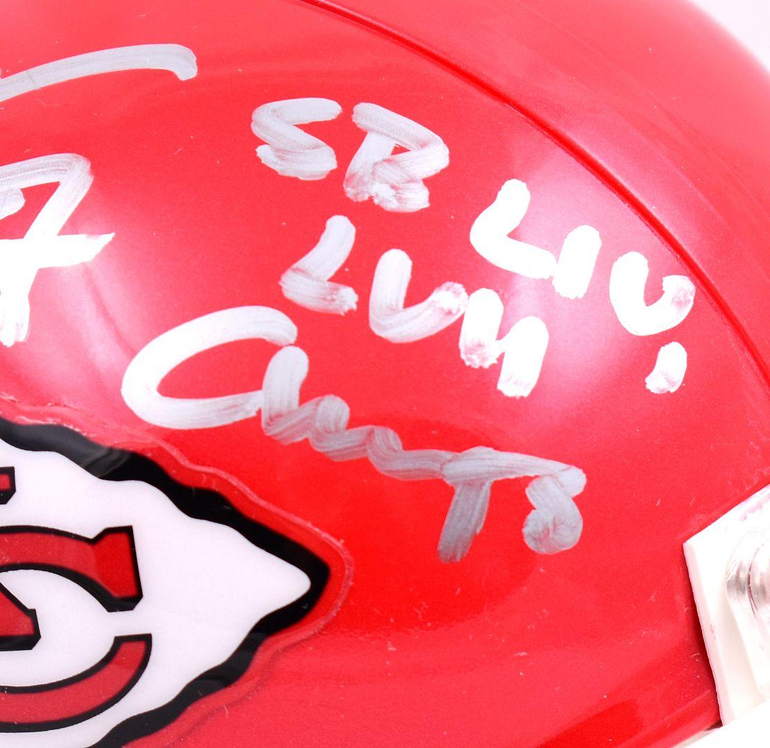 Riddell Kansas City Chiefs mini helmet. Hand-signed and inscribed by Travis Kelce.