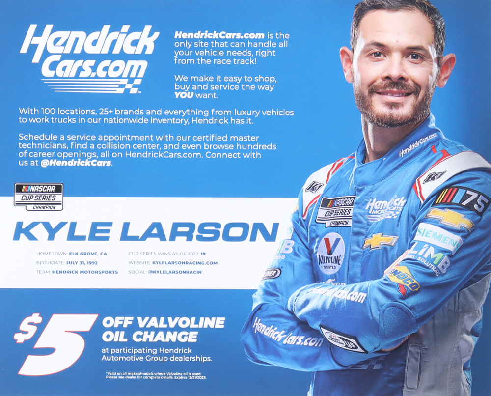 Photo measures 8" x 10" in size and has been hand-signed by Kyle Larson.