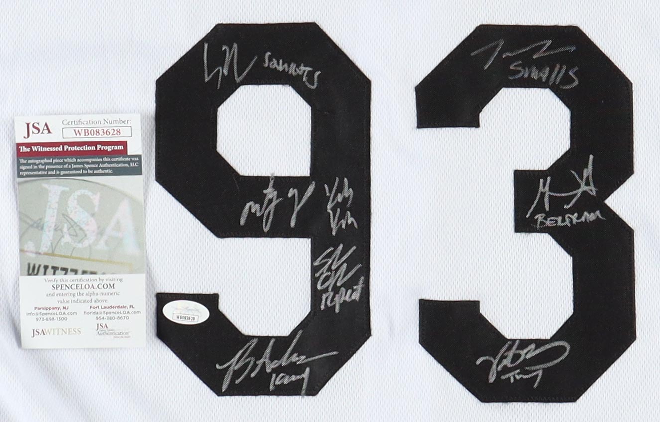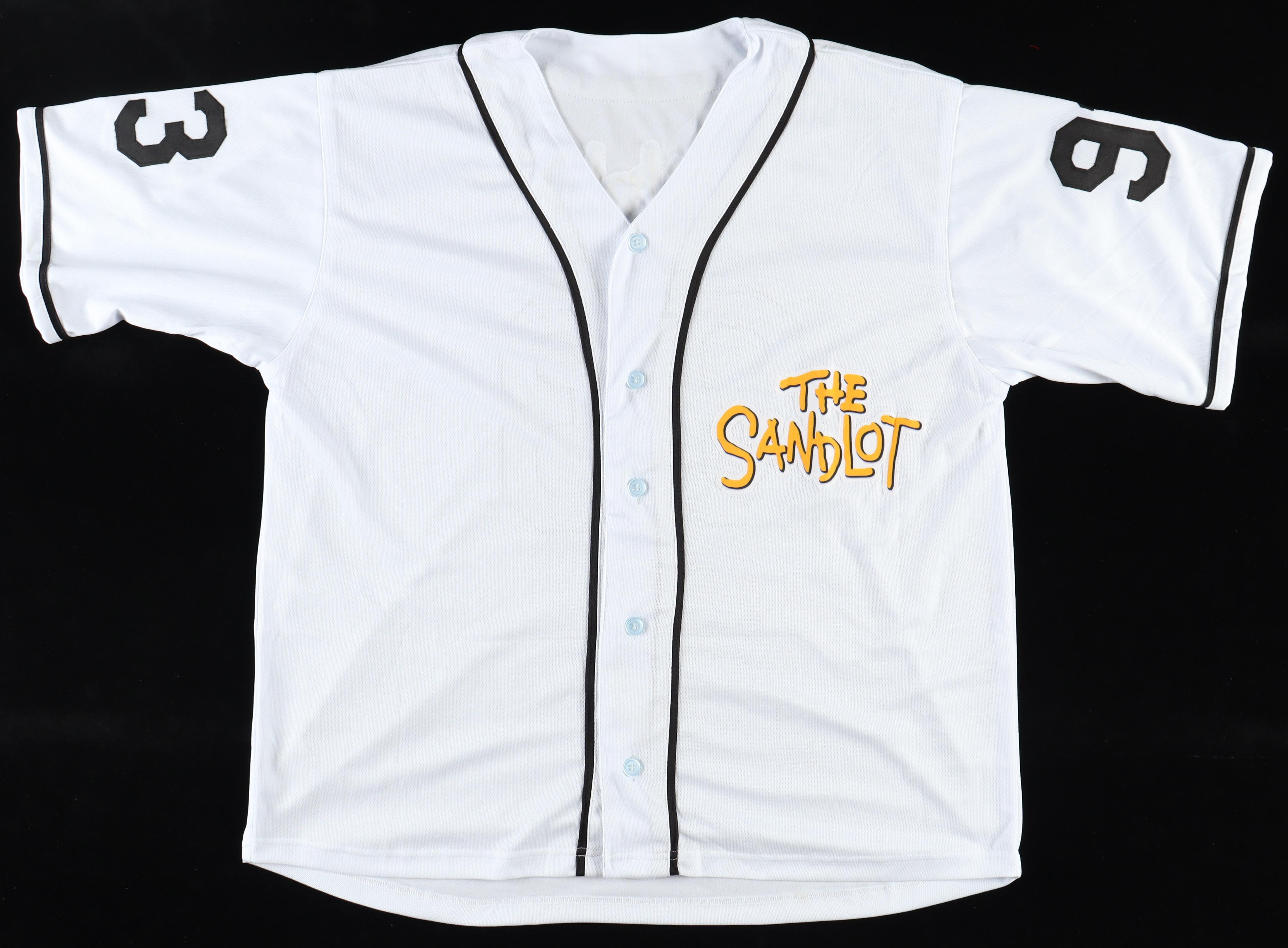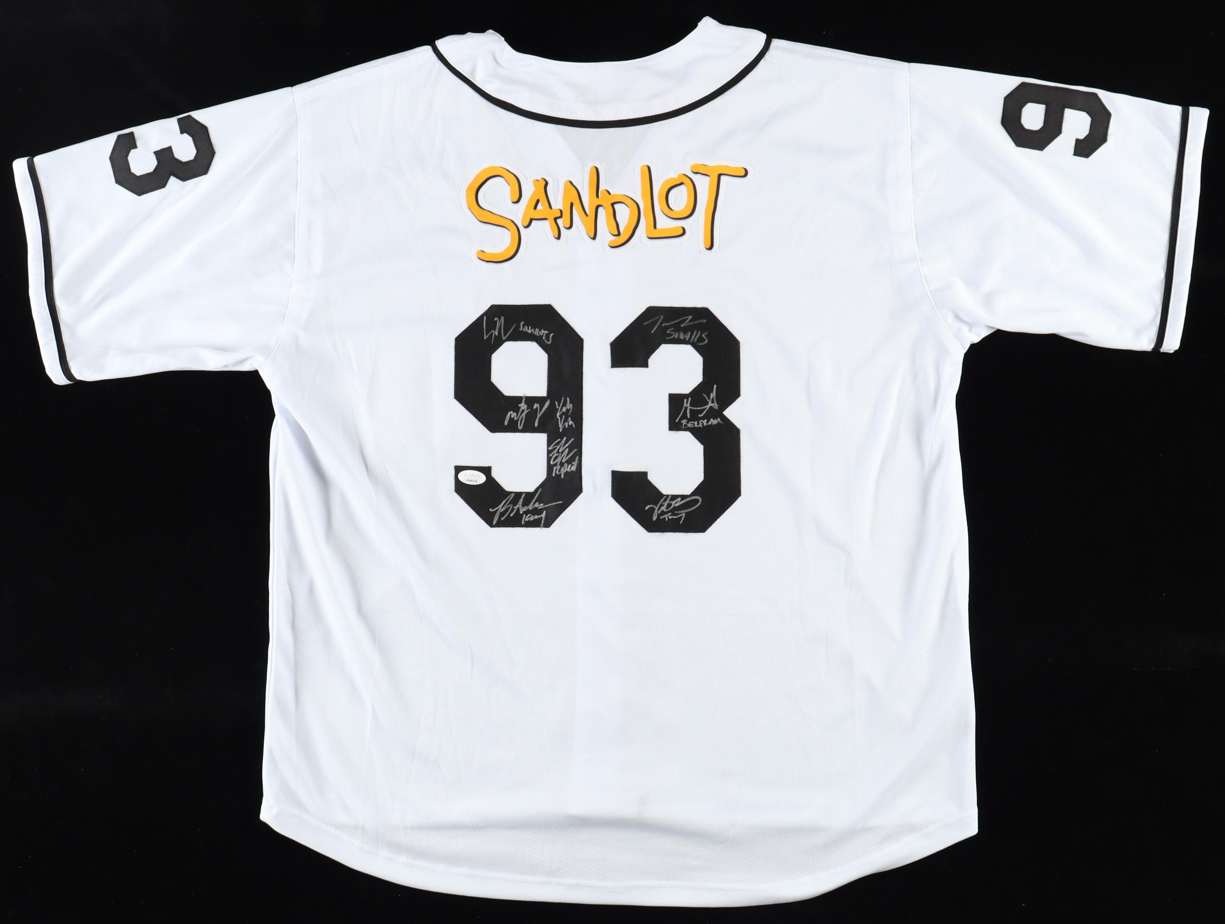 Custom jersey with everything sewn on, size XL. Hand-signed and inscribed by Tom Guiry (Scotty Smalls), Victor DiMattia (Timmy Timmons), Marty York (Alan "Yeah-Yeah" McClennan), Shane Obedzinski (Tommy 'Repeat' Timmons), Grant Gelt (Bertram Grover Weeks), Chauncey Leopardi (Michael "Squints" Palledorous) and Brandon Adams (Kenny DeNunez).