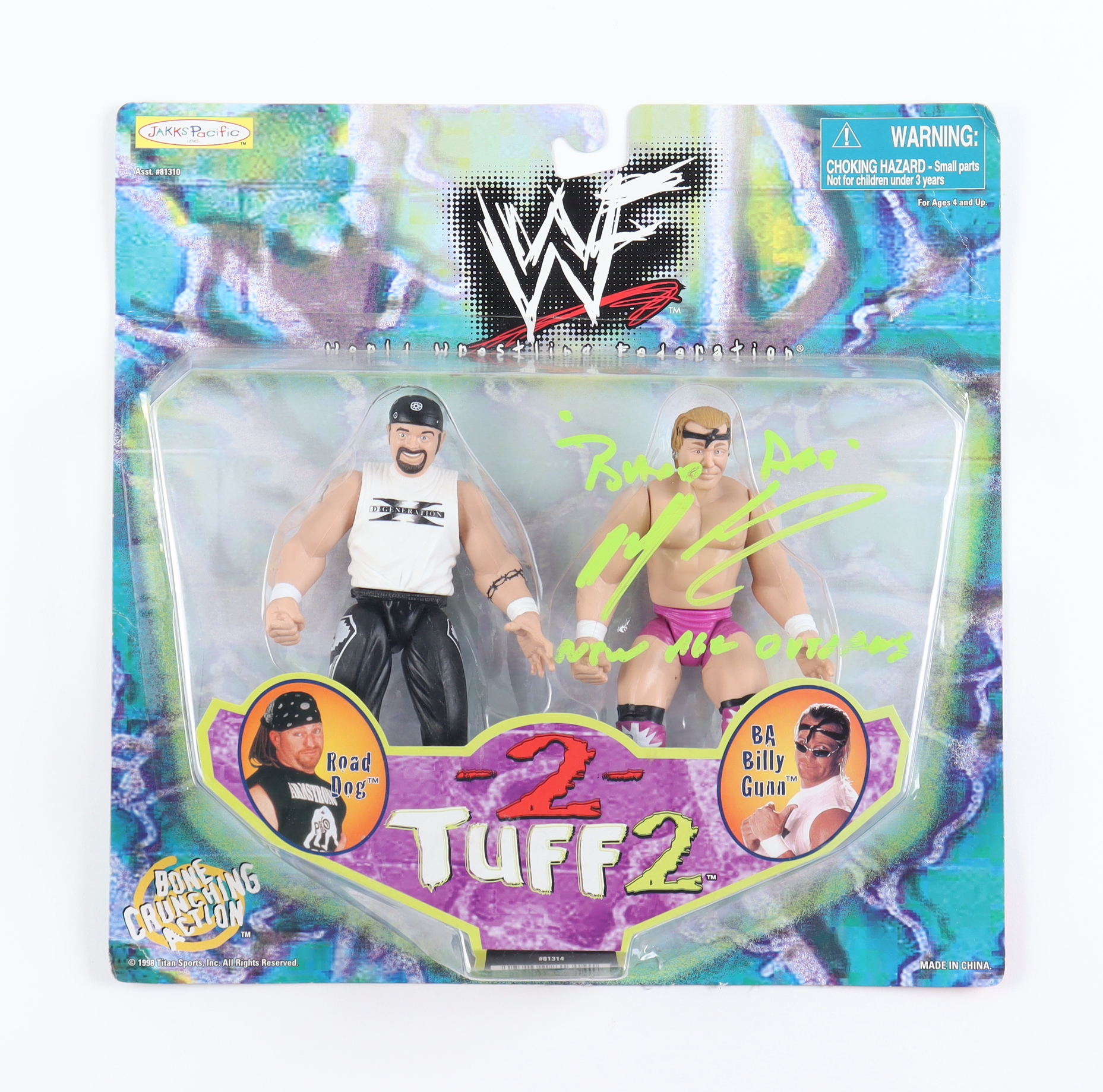 WWE Wrestling WWF 2 Tuff 2 Road Dog vs. BA Billy Gunn Action Figure 2-Pack has been hand-signed by Billy Gunn. Please note, the original packaging has corner and edge wear.