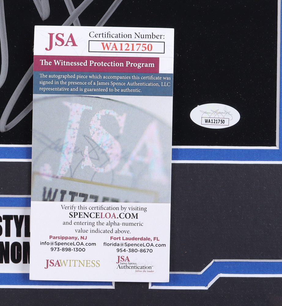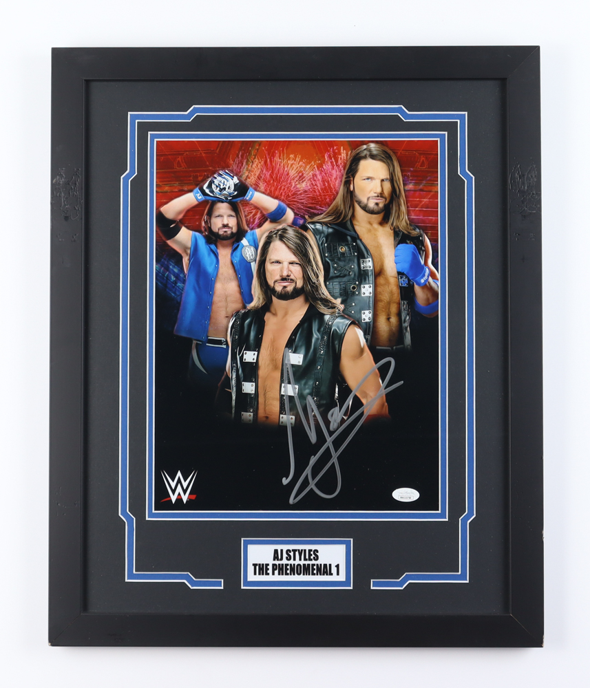 Custom framed display measures approximately 18" x 22" in size and features a photo that has been hand-signed by AJ Styles (HOF). Please note there is damage to the sides of the frame.