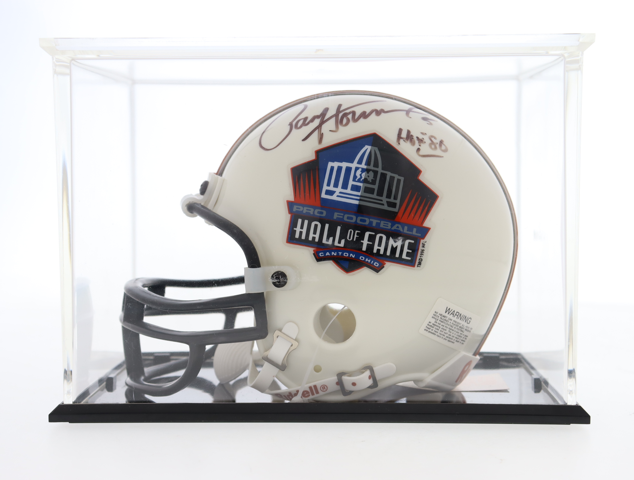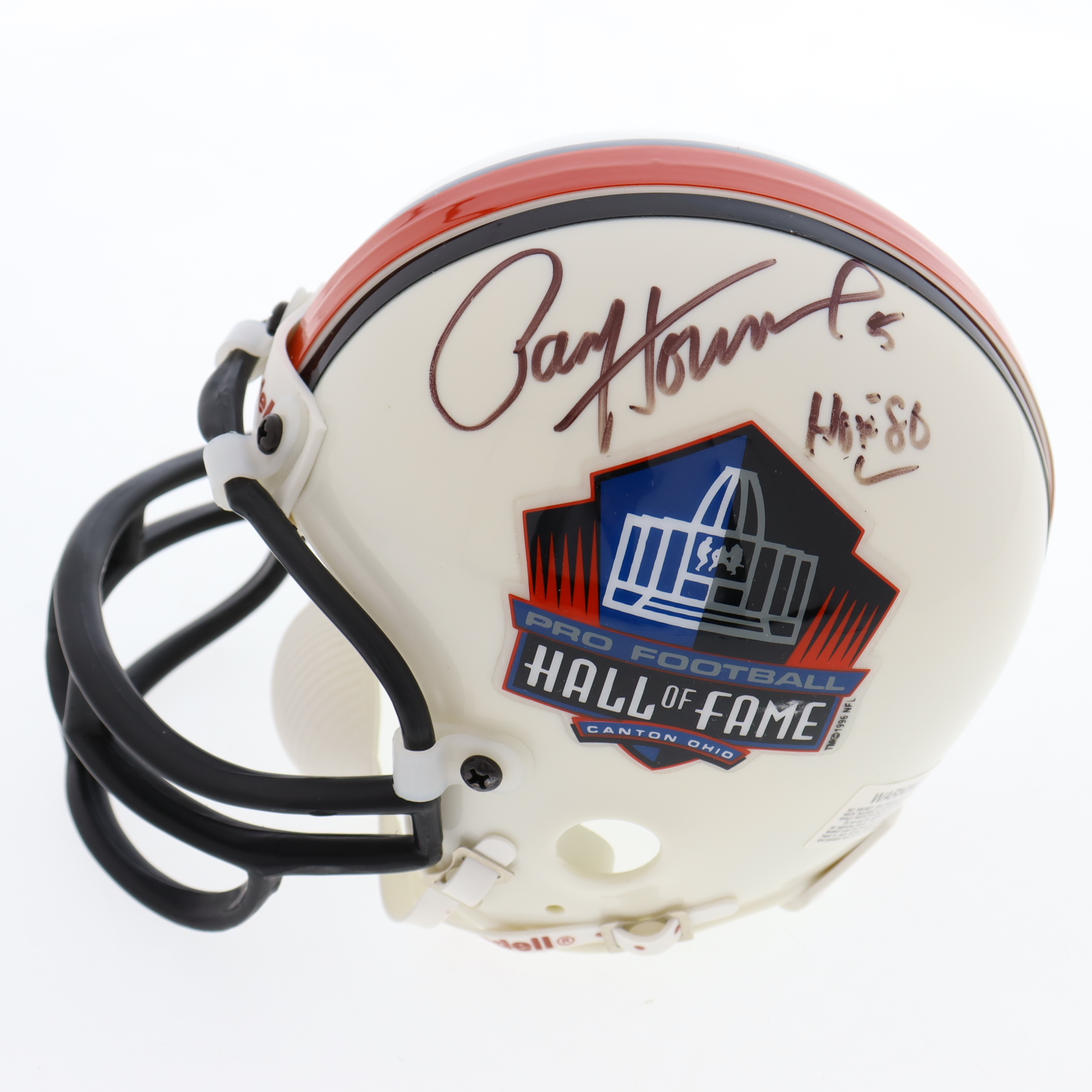 Riddell Hall of Fame Logo mini helmet has been hand-signed and inscribed by Paul Hornung (D. 2020, Green Bay Packers, HOF). The display case is included as shown.