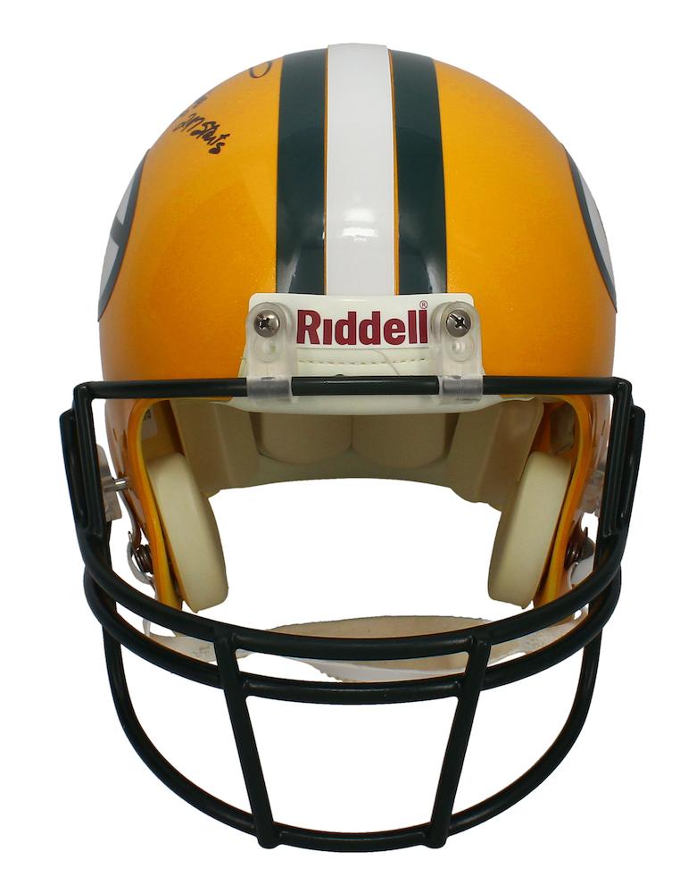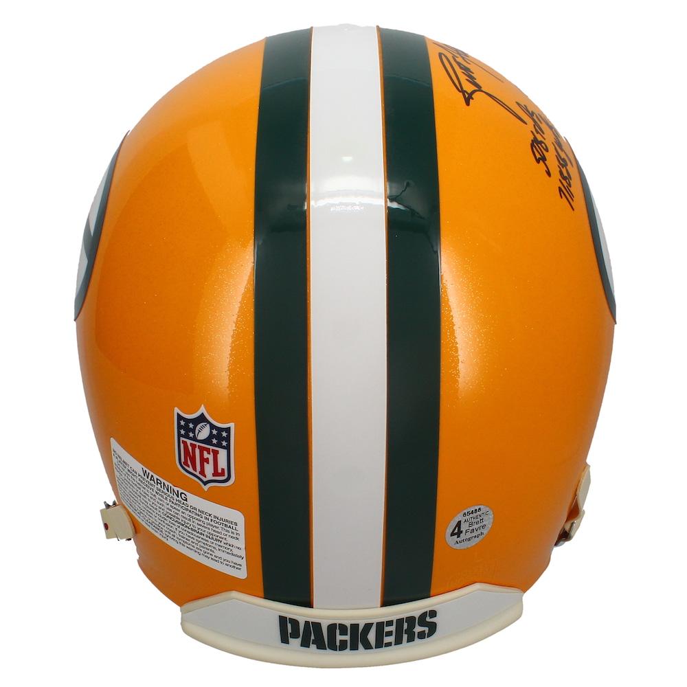 Riddell Green Bay Packers full-size authentic, on-field helmet. Hand-signed and inscribed by Brett Favre (HOF).