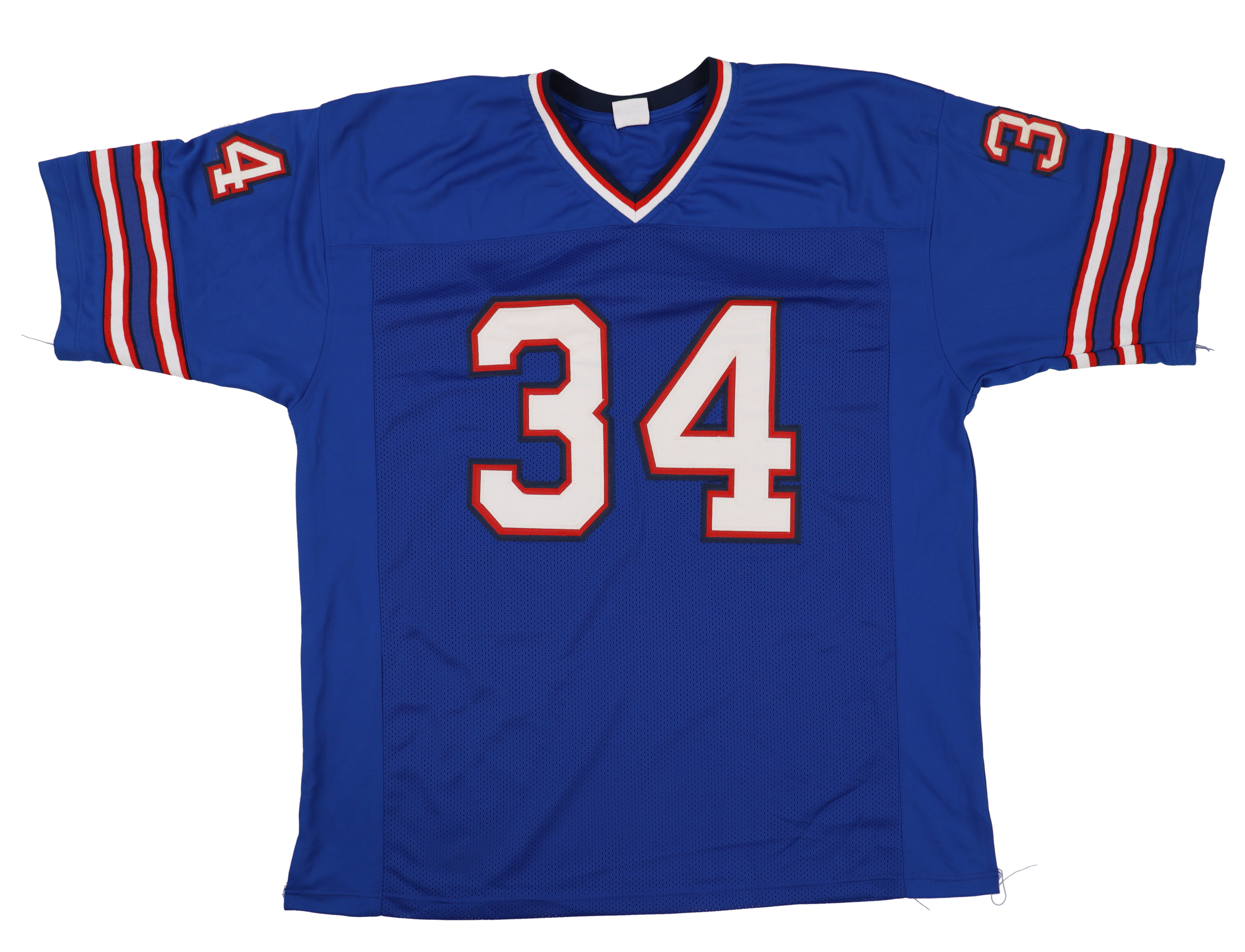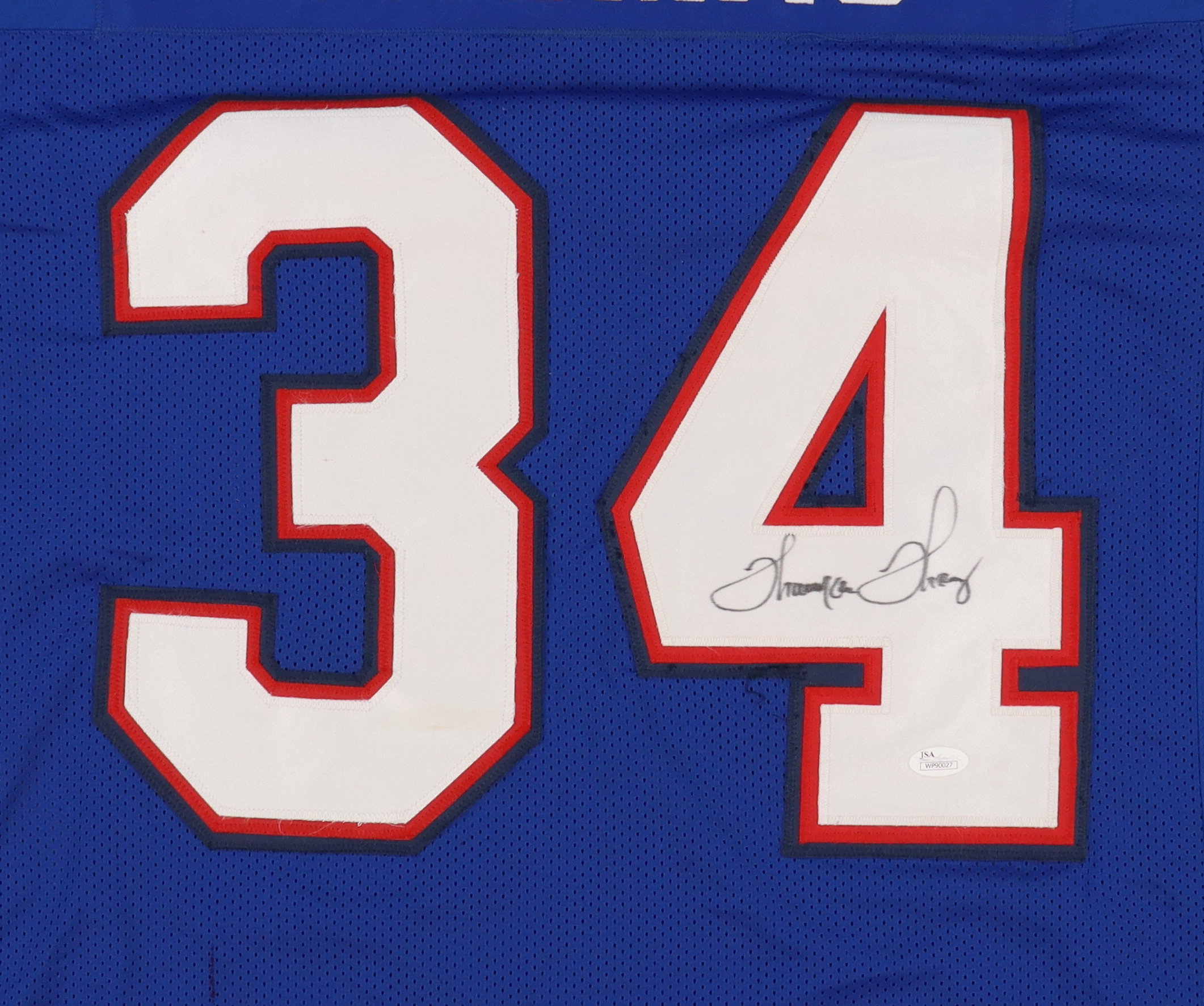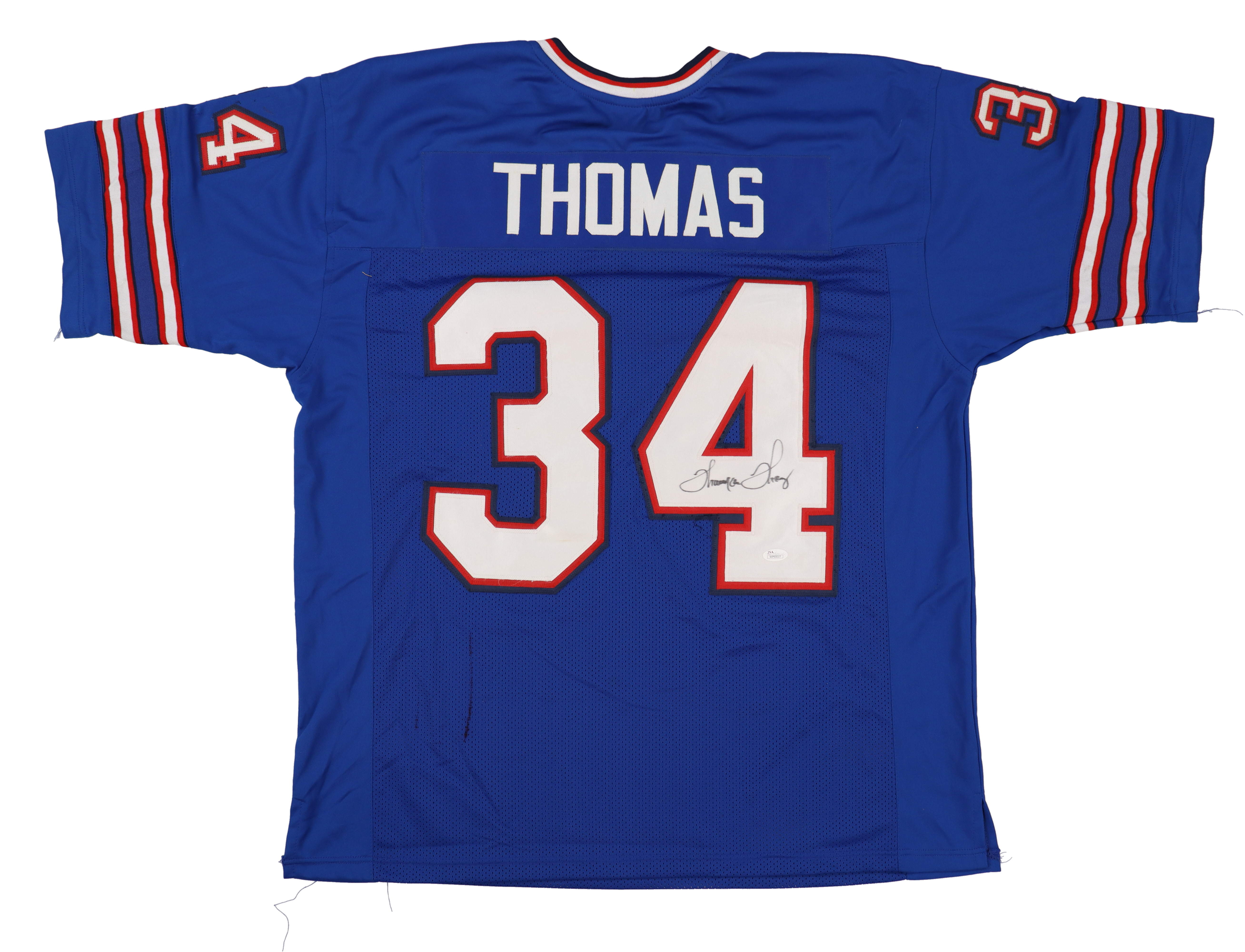 Custom jersey. Everything sewn on, size XL. Hand-signed by Thurman Thomas (HOF).