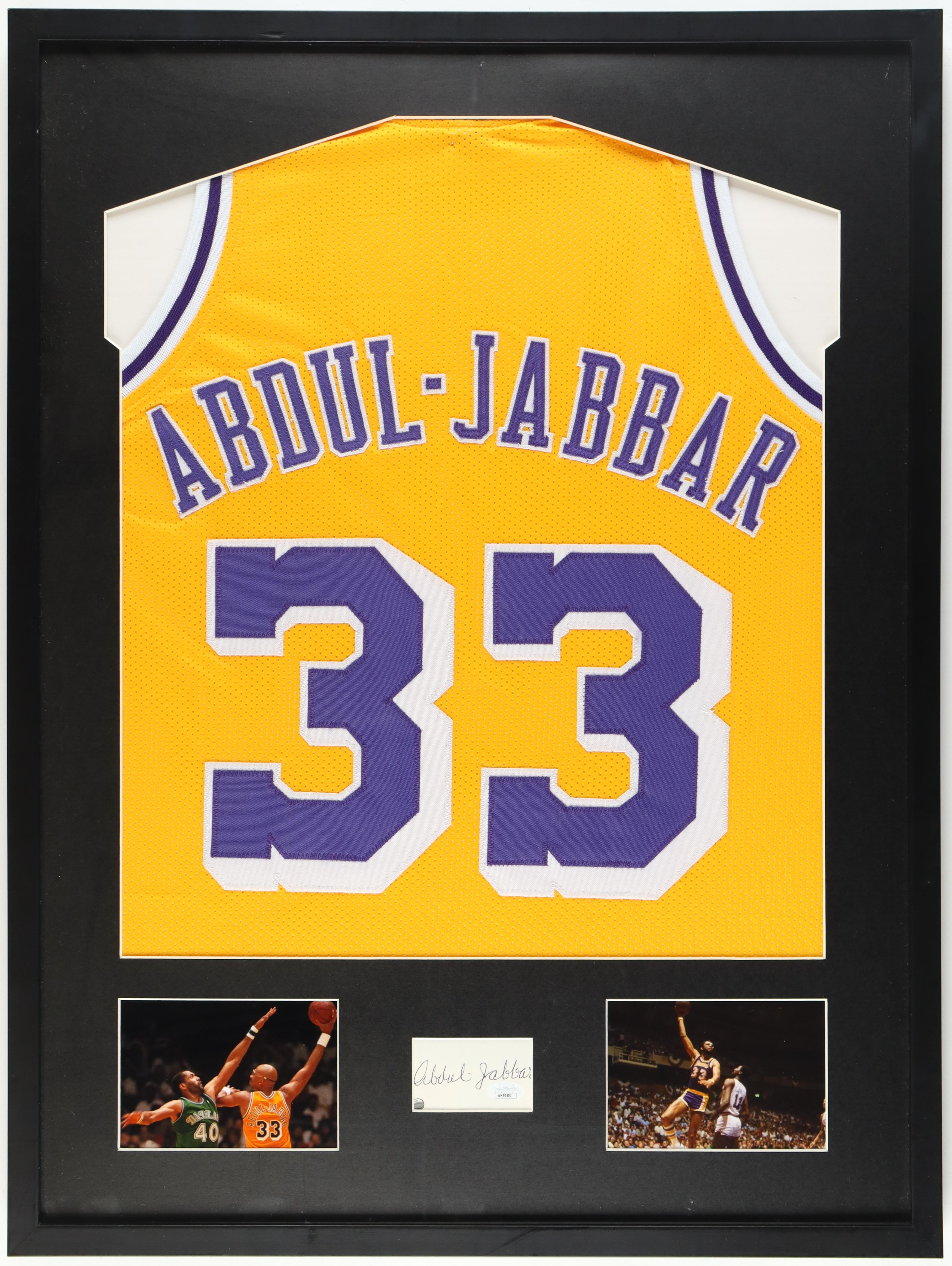 Custom frame measures 23.5" x 31.5" in size and features a cut that has been hand signed by Kareem Abdul-Jabbar (HOF). The display also includes an unsigned jersey. Please note, there is scuffing on the frame.