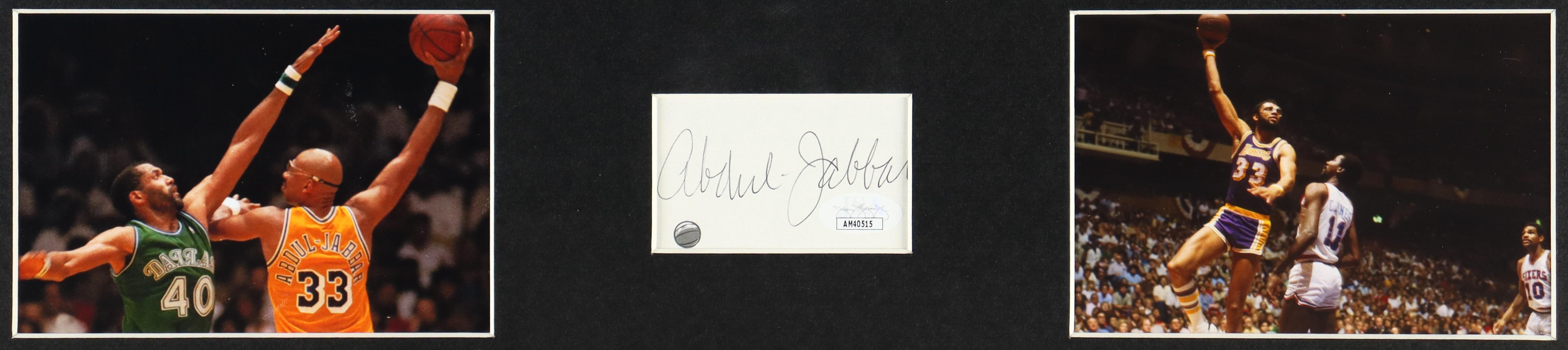 Custom frame measures 23.5" x 31.5" in size and features a cut that has been hand signed by Kareem Abdul-Jabbar (HOF). The display also includes an unsigned jersey. Please note, there is scuffing on the frame.