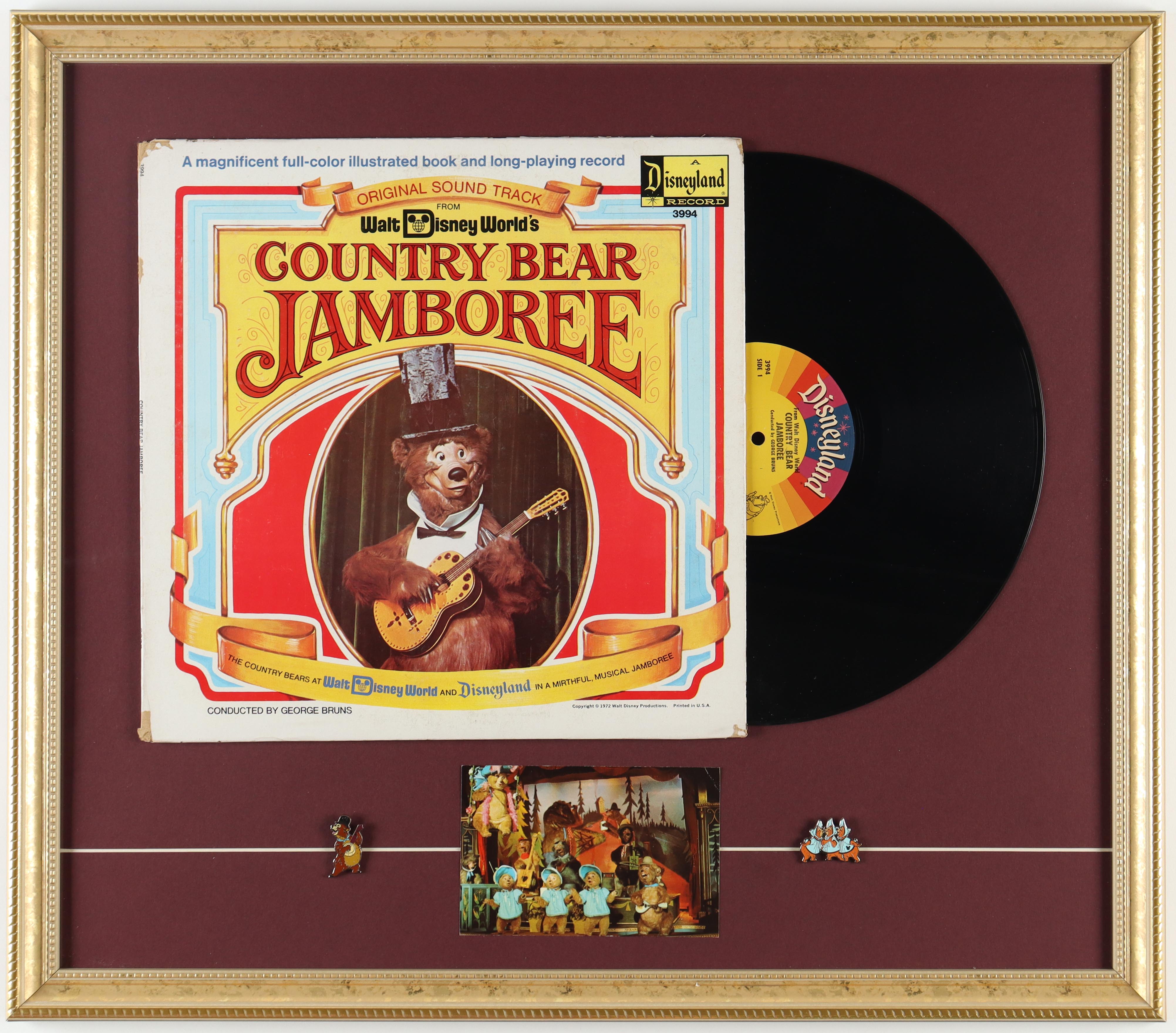 Custom frame measures 21" x 24" in size and features an Original Walt Disney "Country Bear Jamboree" vinyl record. The display also includes (2) character pins. Please note, the vinyl record is included as shown and the display is not signed.