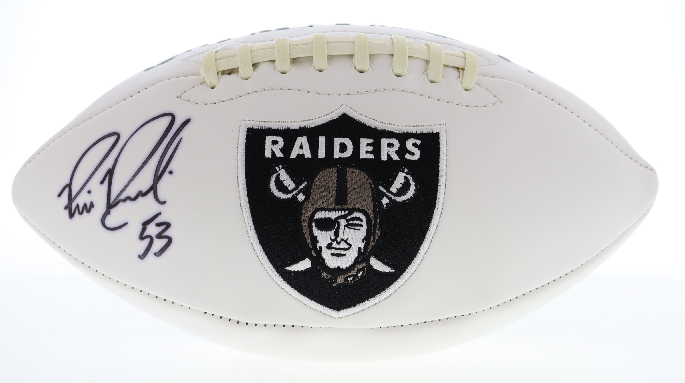 Las Vegas Raiders logo football has been hand-signed by Bill Romanowski (Oakland Raiders).