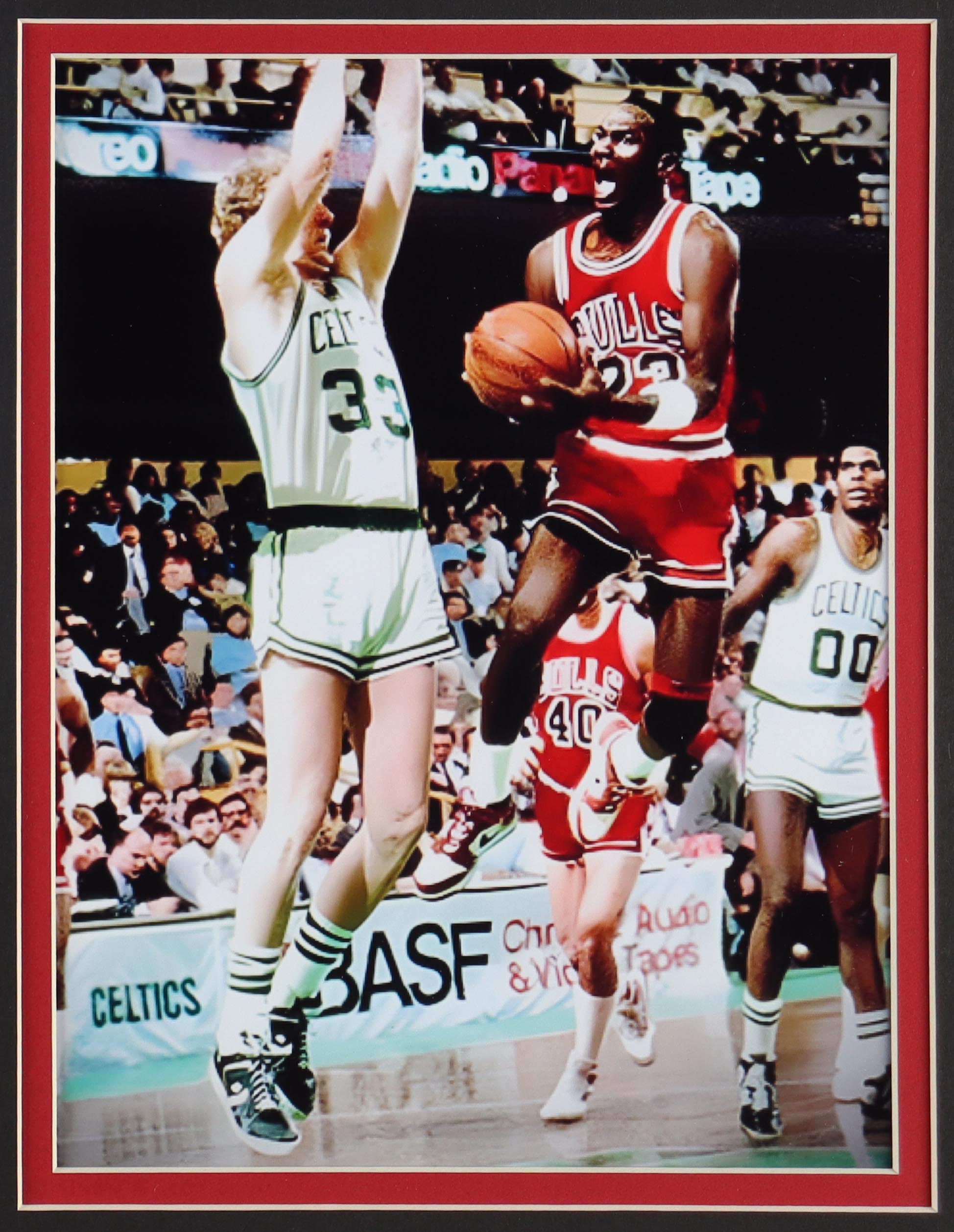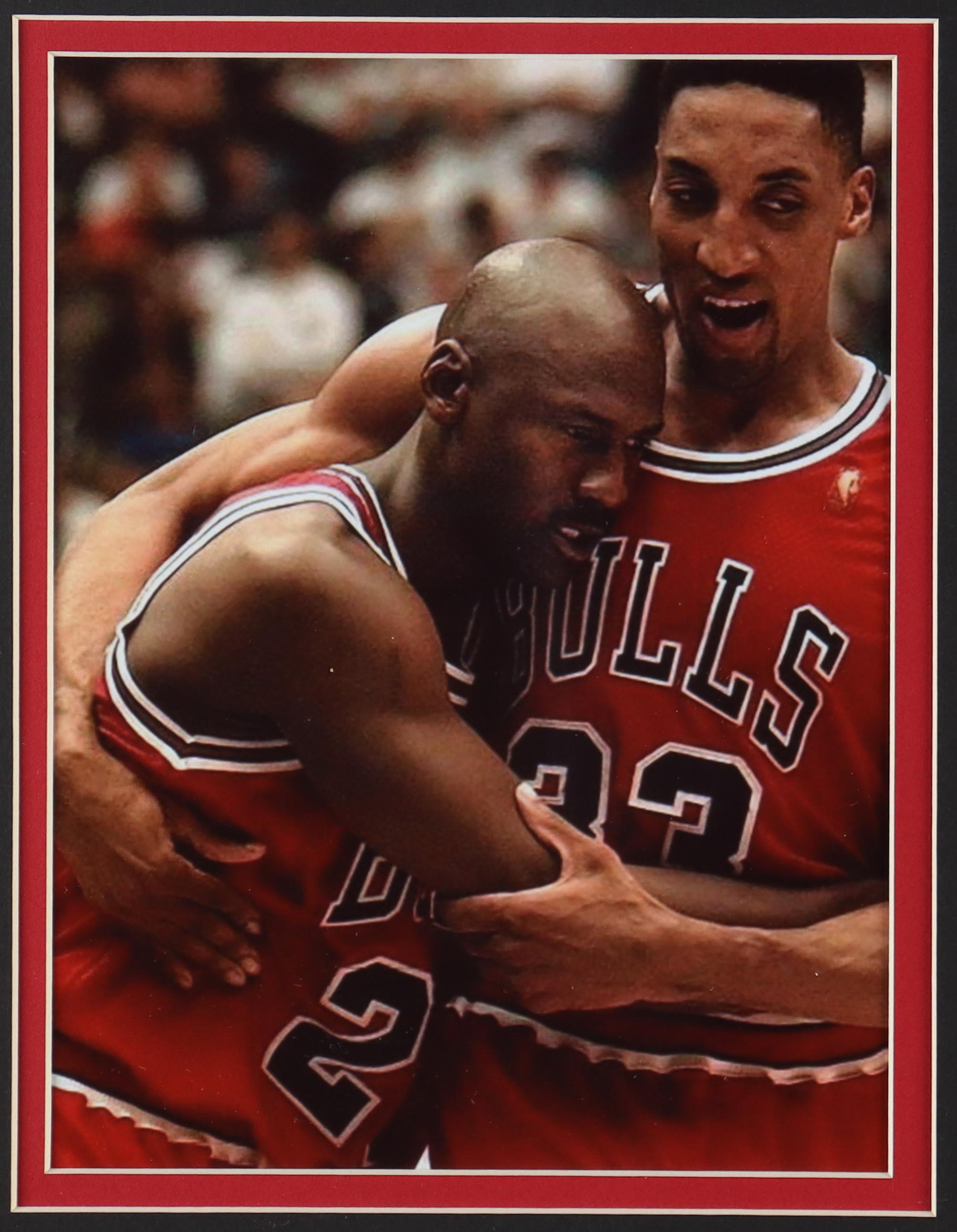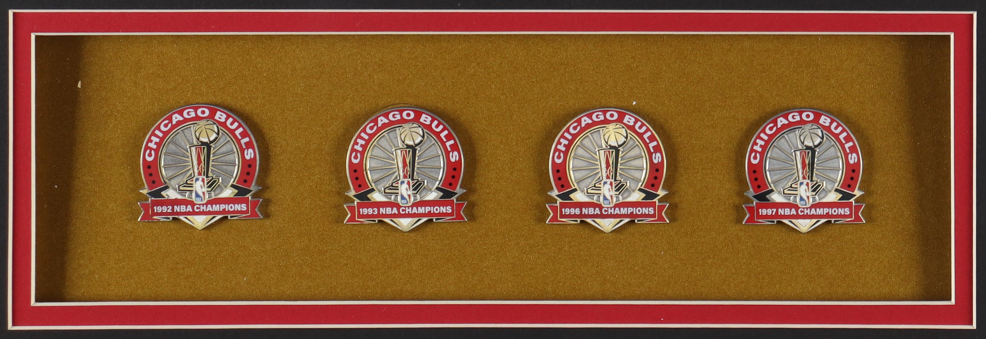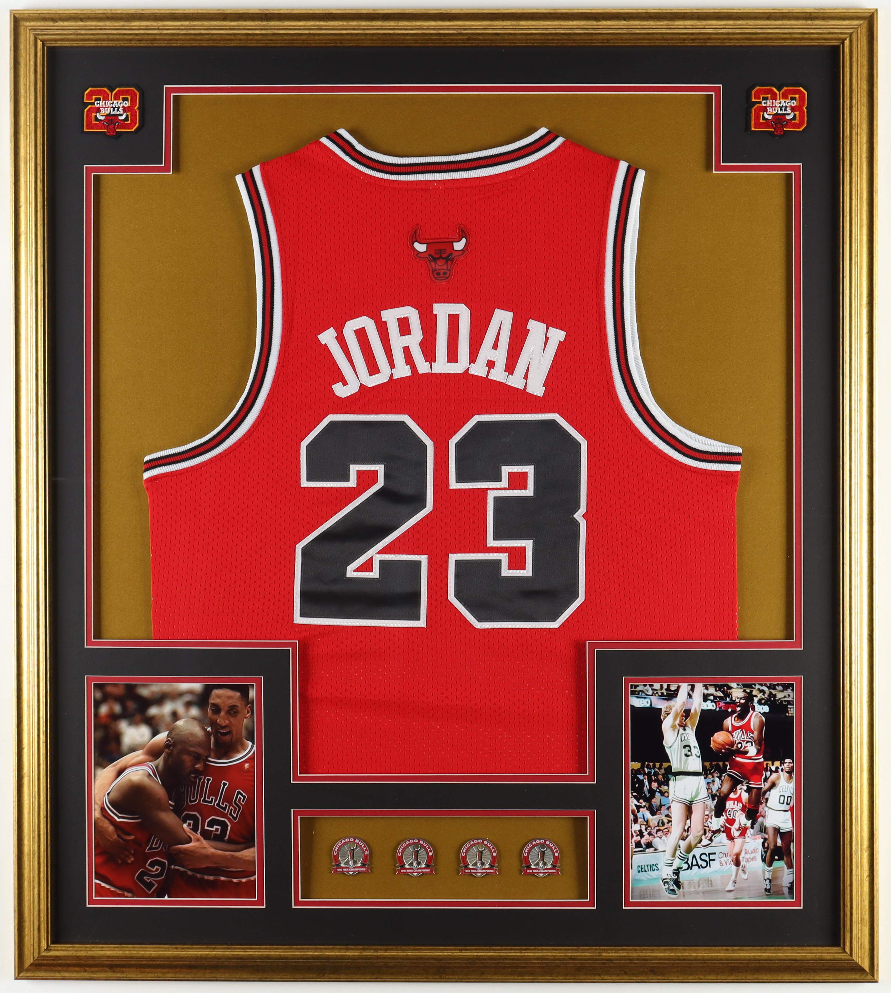 Custom frame measures approximately 33" x 37" in size and features a Michael Jordan (HOF) jersey. The display also includes (4) championship pins. Pins are each limited edition #1000. Please note, the display is unsigned.